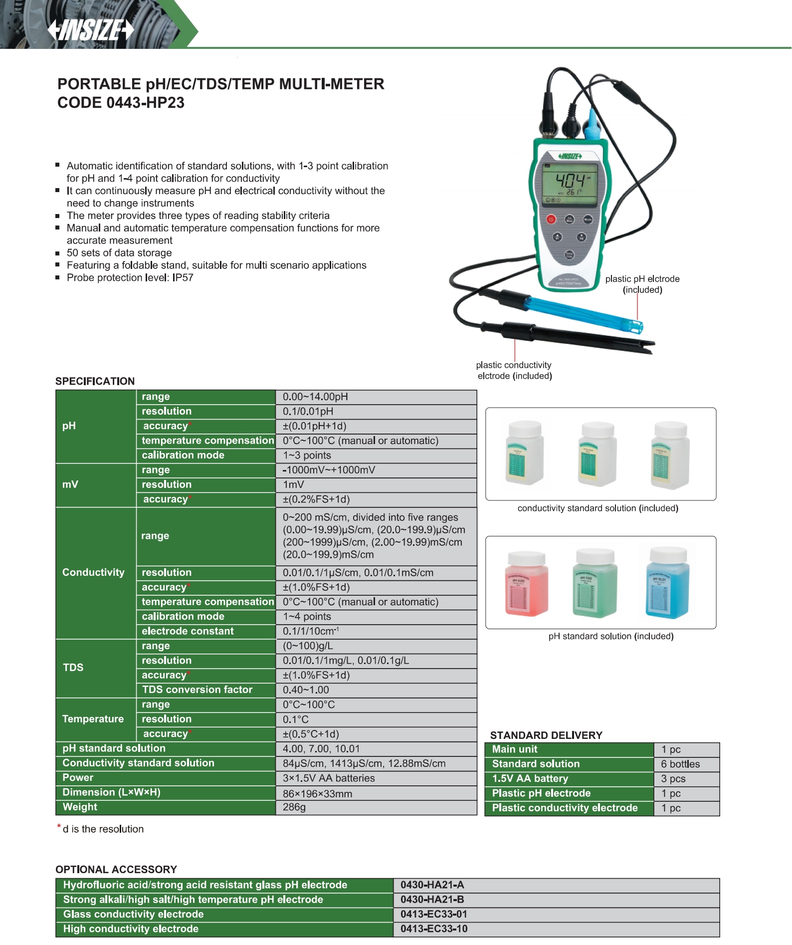 | 0443-HP23 | Conductivity/TDS, pH/mV | Off-line | 0.00~14.00pH, -1000mV~+1000mV, 0~200mS/cm, divided into five ranges (0.00~19.99)µS/cm, (20.0~199.9)µS/cm, (200~1999)µS/cm, (2.00~19.99)mS/cm, (20.0~199.9)mS/cm, (0~100)g/L, 0°C~100°C | no |
