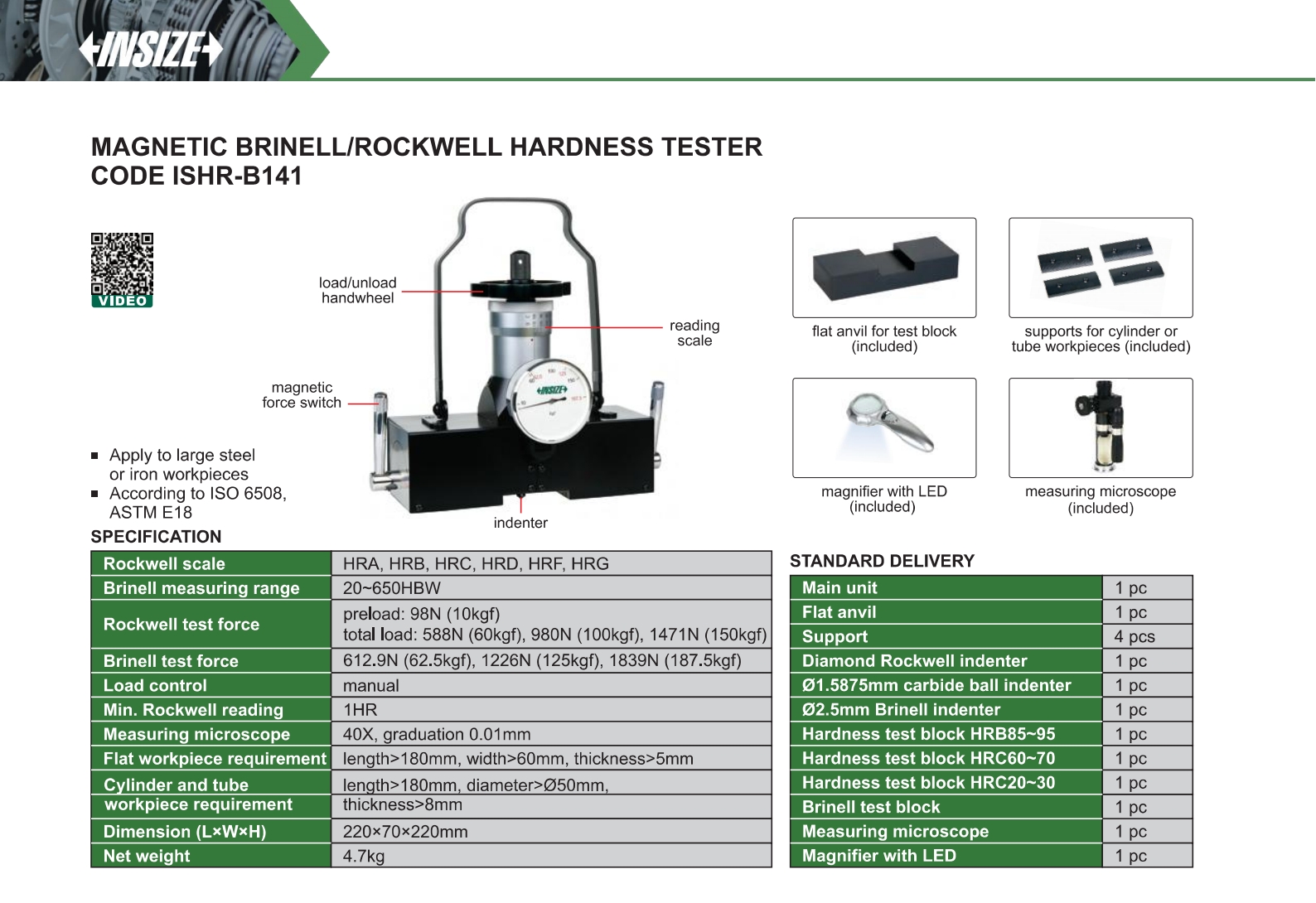 | ISHR-B141 | brinell: 20~650HBW | rockwell: HRA, HRB, HRC, HRD, HRF, HRG | preload: 10kgf, total load: 60kgf, 100kgf,150kgf | 62.5kgf, 125kgf, 187.5kgf |