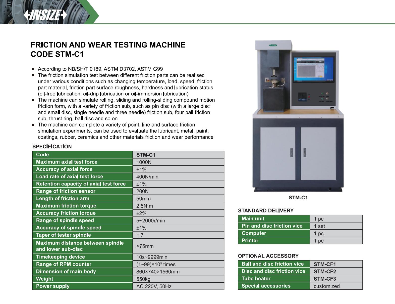 The friction simulation test between different friction parts can be realised under various conditions such as changing temperature, load, speed, friction part material, friction part surface roughness, hardness and lubrication status (oil-free lubrication, oil-drip lubrication or oil-immersion lubrication)