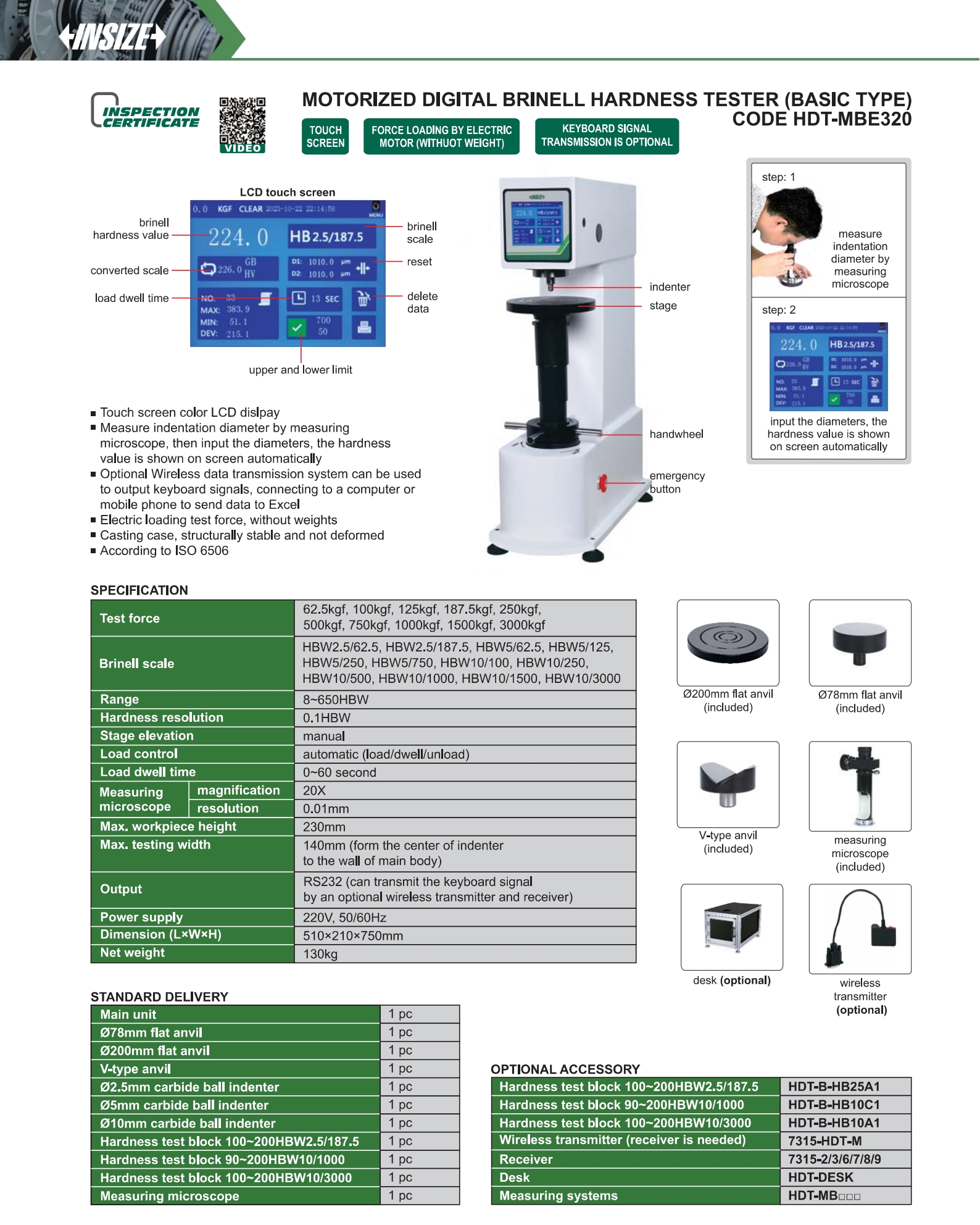 | HDT-MBE320 | 62.5kgf, 100kgf, 125kgf, 187.5kgf, 250kgf, 500kgf, 750kgf, 1000kgf, 1500kgf, 3000kgf | automatic (load/dwell/unload) | 230mm | 140mm (form the center of indenter to the wall of main body) | HBW2.5/62.5, HBW2.5/187.5, HBW5/62.5, HBW5/125, HBW5/250, HBW5/750, HBW10/100, HBW10/250, HBW10/500, HBW10/1000, HBW10/1500, HBW10/3000 |