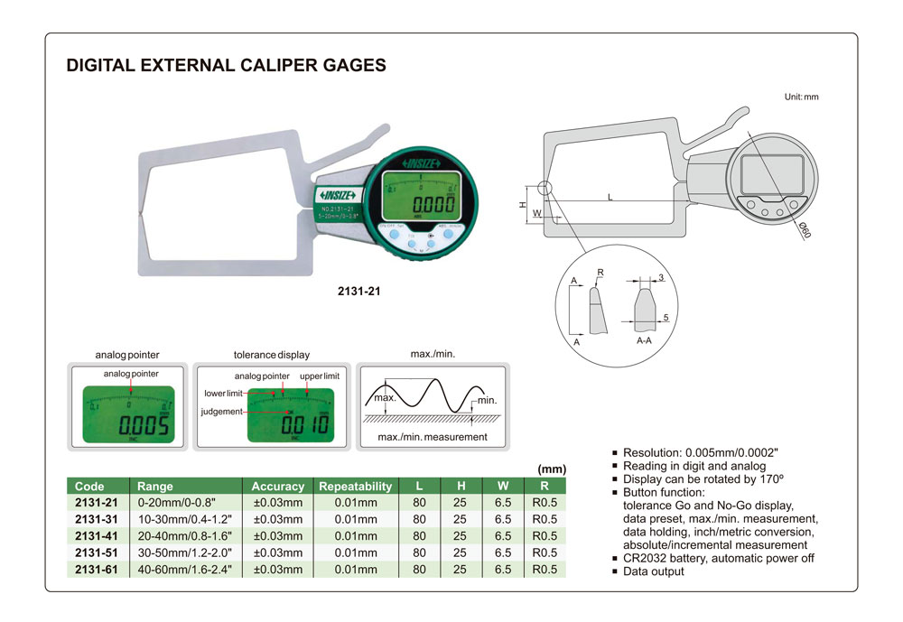 | 2131-21 | 0-20mm/0-0.8" | ±0.03mm | 0.005mm/0.0002" |