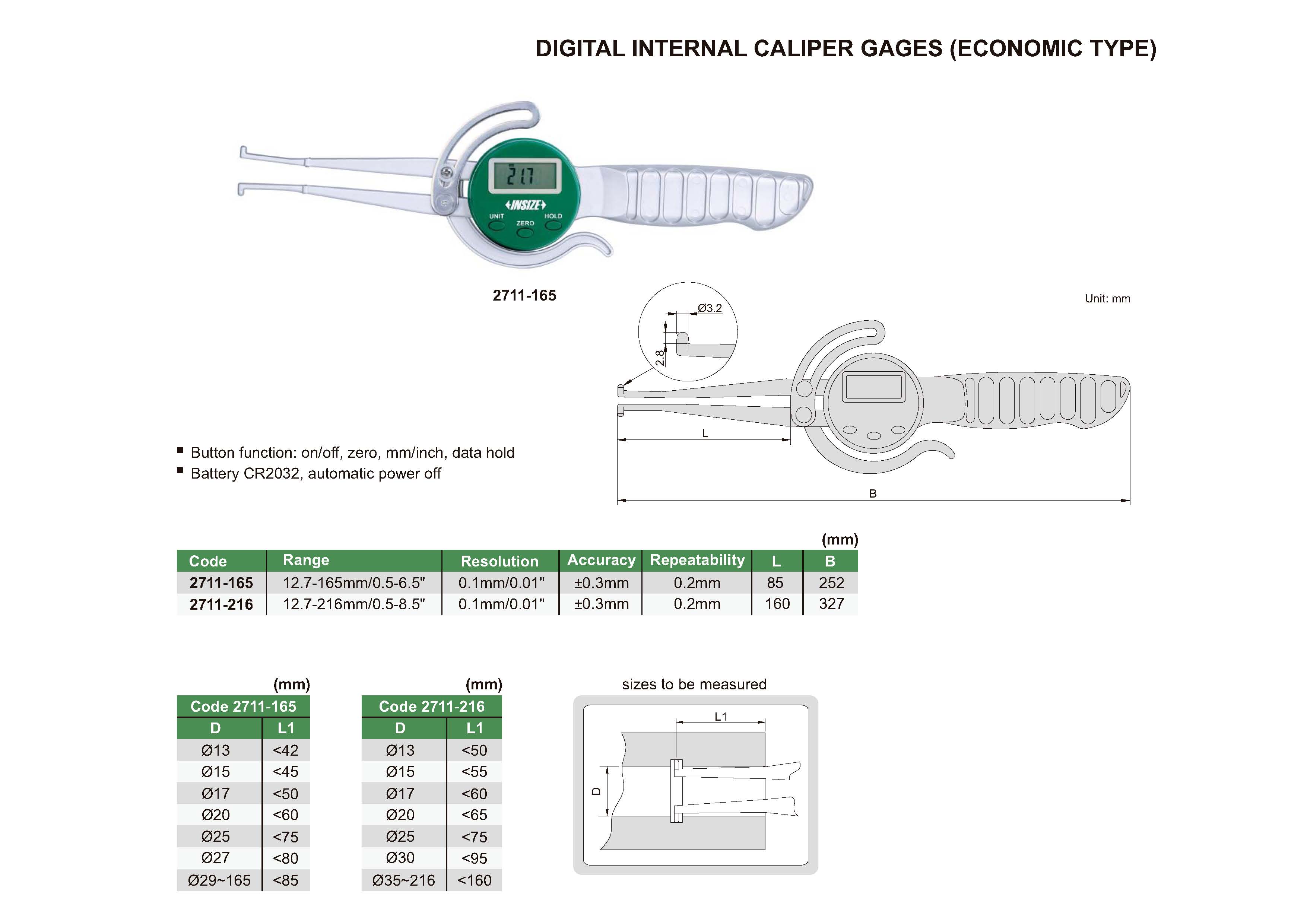 | 2711-216 | 12.7-216mm/0.5-8.5" | ±0.3mm | 0.1mm/0.01" |