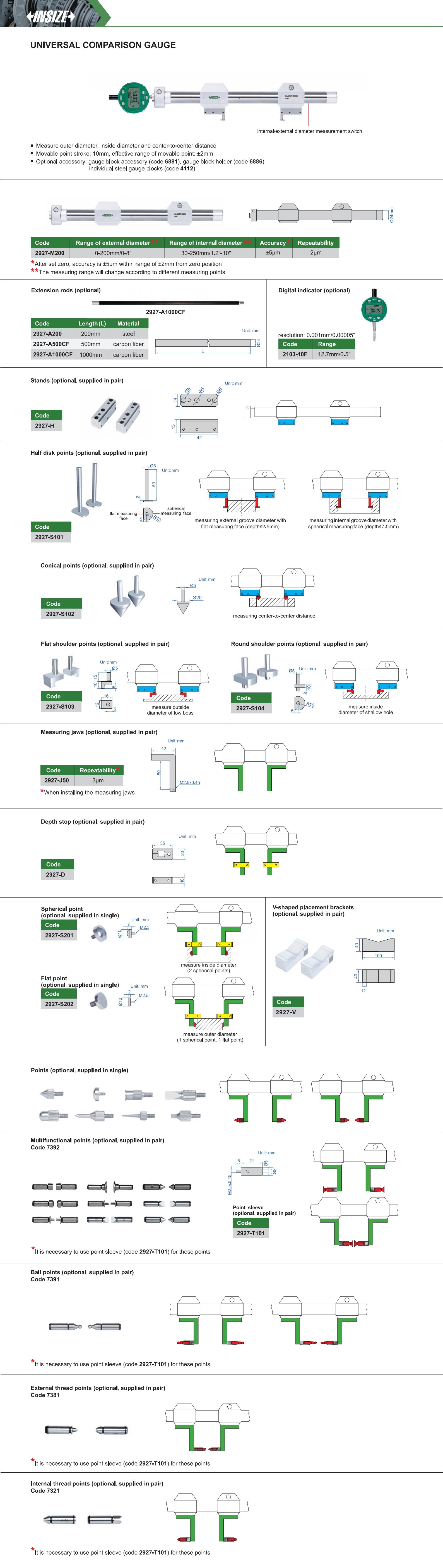 | 2927-M200 | ±5µm | 2µm | 0-200mm/0-8" | 30-250mm/1.2"-10" |