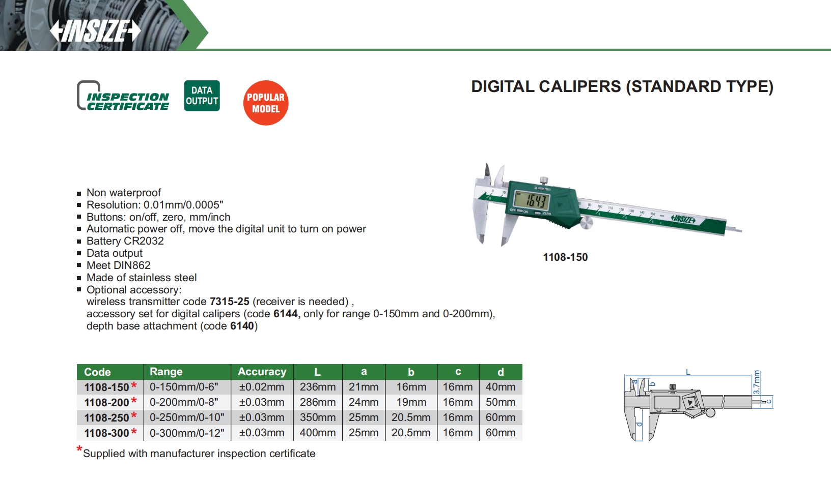 | 1108-150 | 0-150mm/0-6" | ±0.02mm | 0.01mm/0.0005" | with data interface |