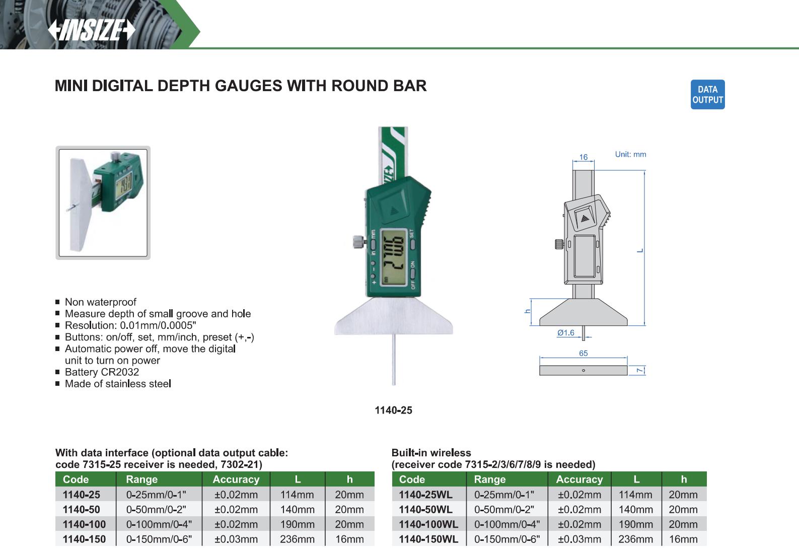| 1140-25 | 0-25mm/0-1" | ±0.02mm | 0.01mm/0.0005" | with data interface |