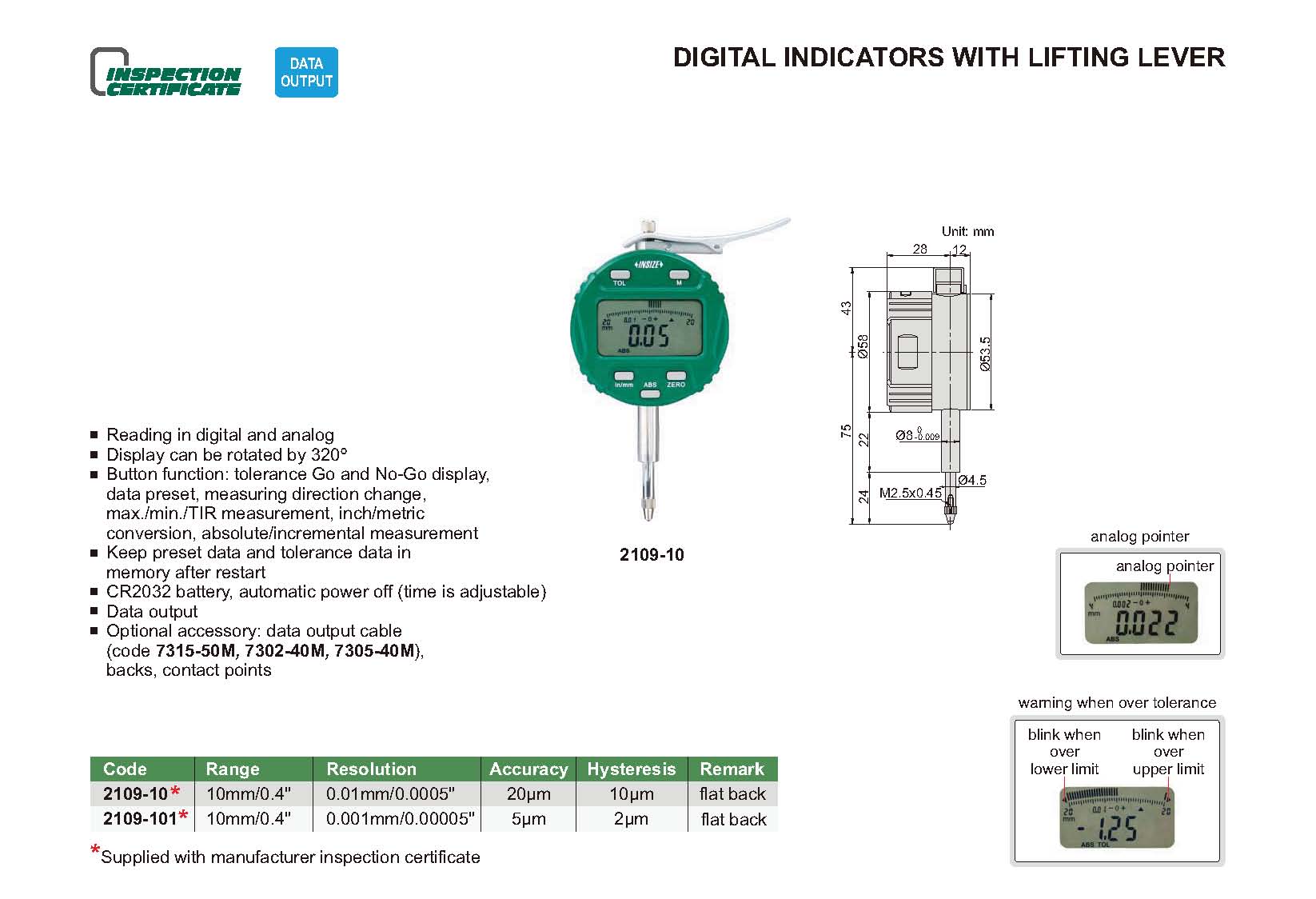 Button function: tolerance Go and No-Go display, data preset, measuring direction change, max./min./TIR measurement, inch/metric conversion,absolute/incremental measurement