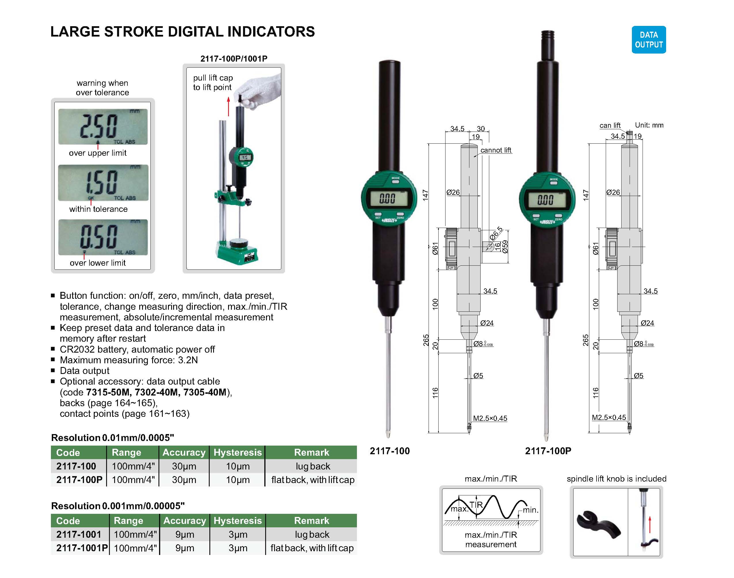 Button function: on/off, zero, mm/inch, data preset, tolerance, change measuring direction, max./min./TIR measurement, absolute/incremental measurement
