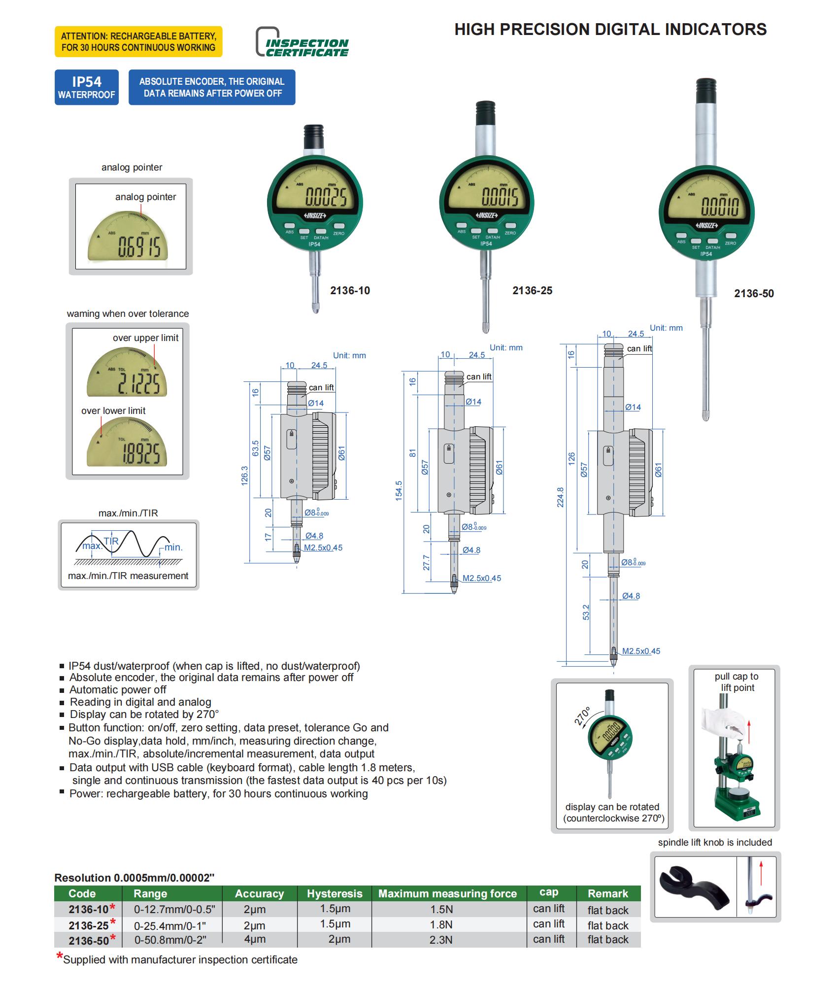 | 2136-10 | 0-12.7mm/0-0.5" | 2µm | 0.0005mm/0.00002" |