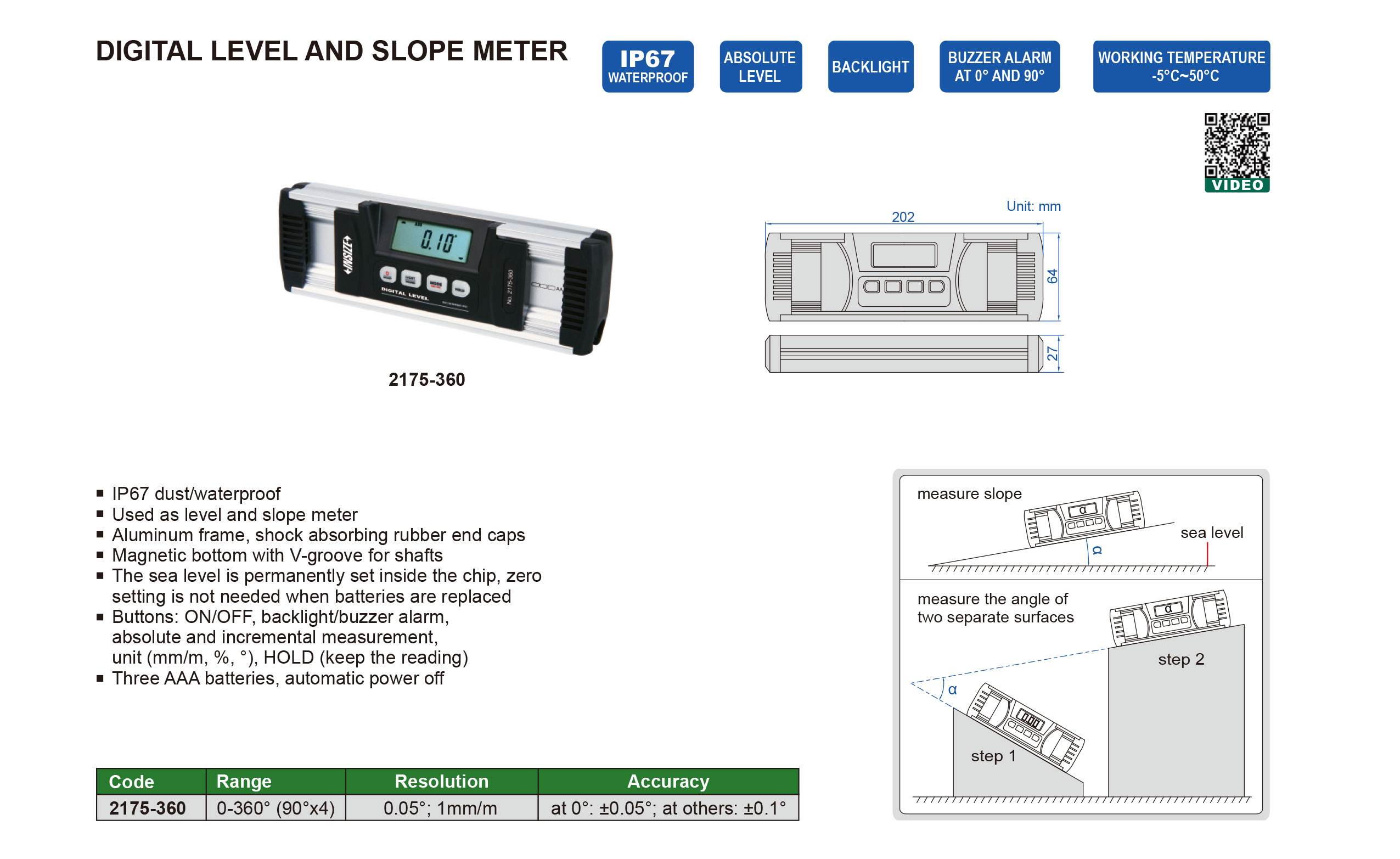 | 2175-360 | 0-360° (90°×4) | at 0°: ±0.05°; at others: ±0.1° | 0.05°; 1mm/m | NO |