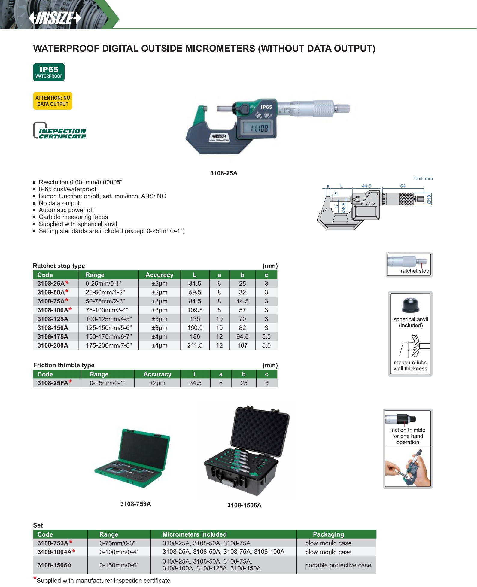 | 3108-25A | ratchet stop | 0-25mm/0-1" | ±2μm | 0.001mm/0.00005" |