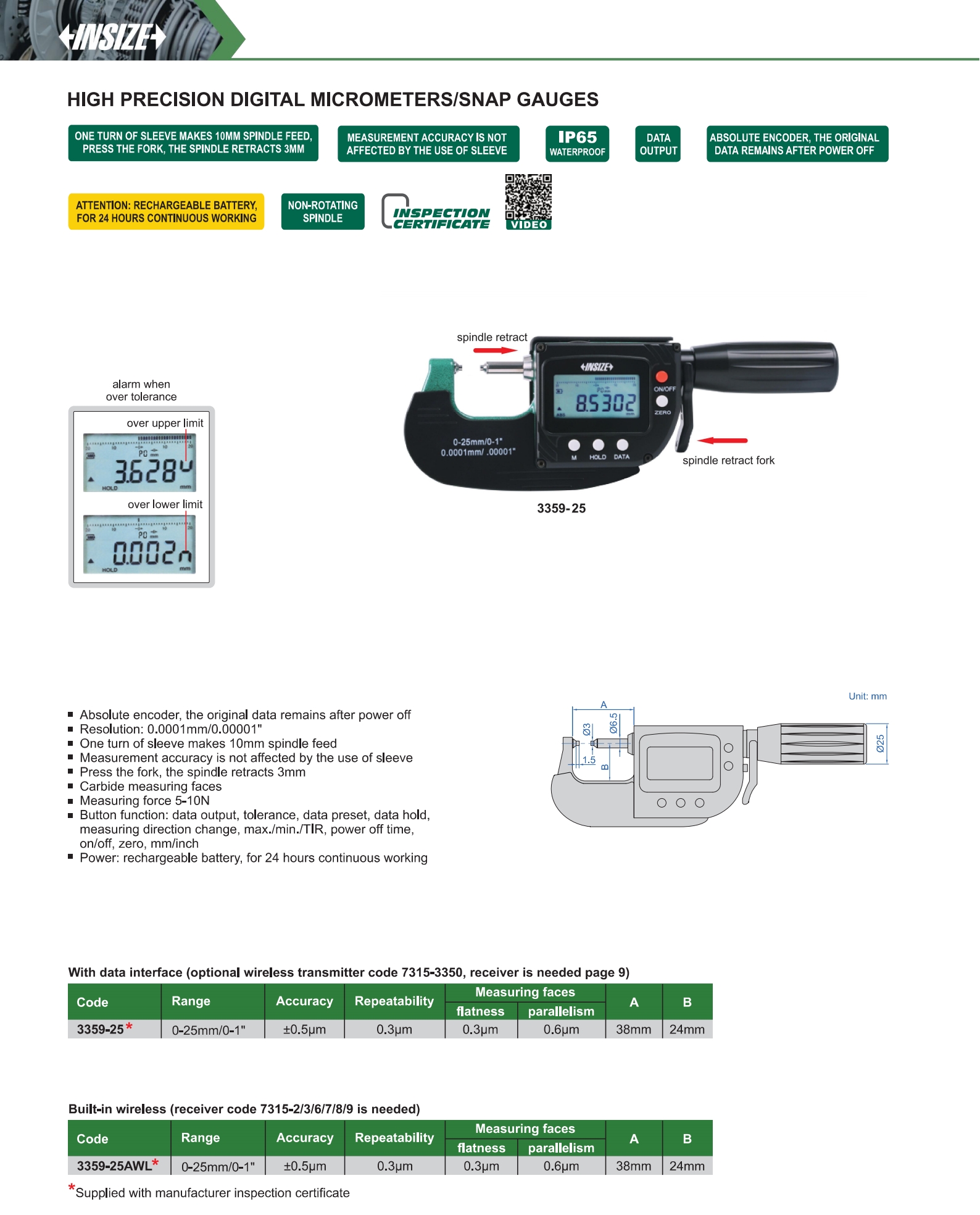| 3359-25AWL | 0-25mm/0-1" | ±0.5µm | 0.0001mm/0.00001" | built-in wireless |