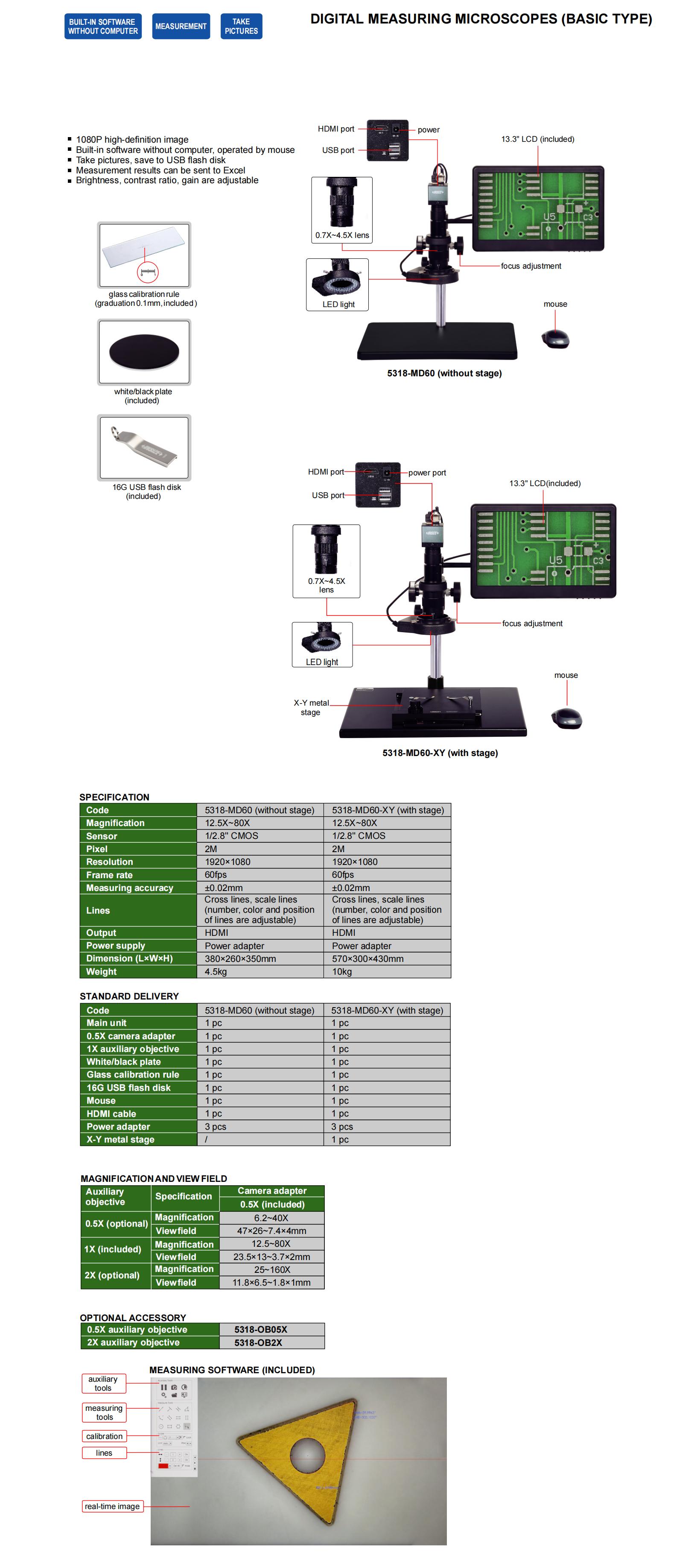 | 5318-MD60 | digital measuring microscopes | 12.5X~80X | 23.5×13~3.7×2mm | 2M |
