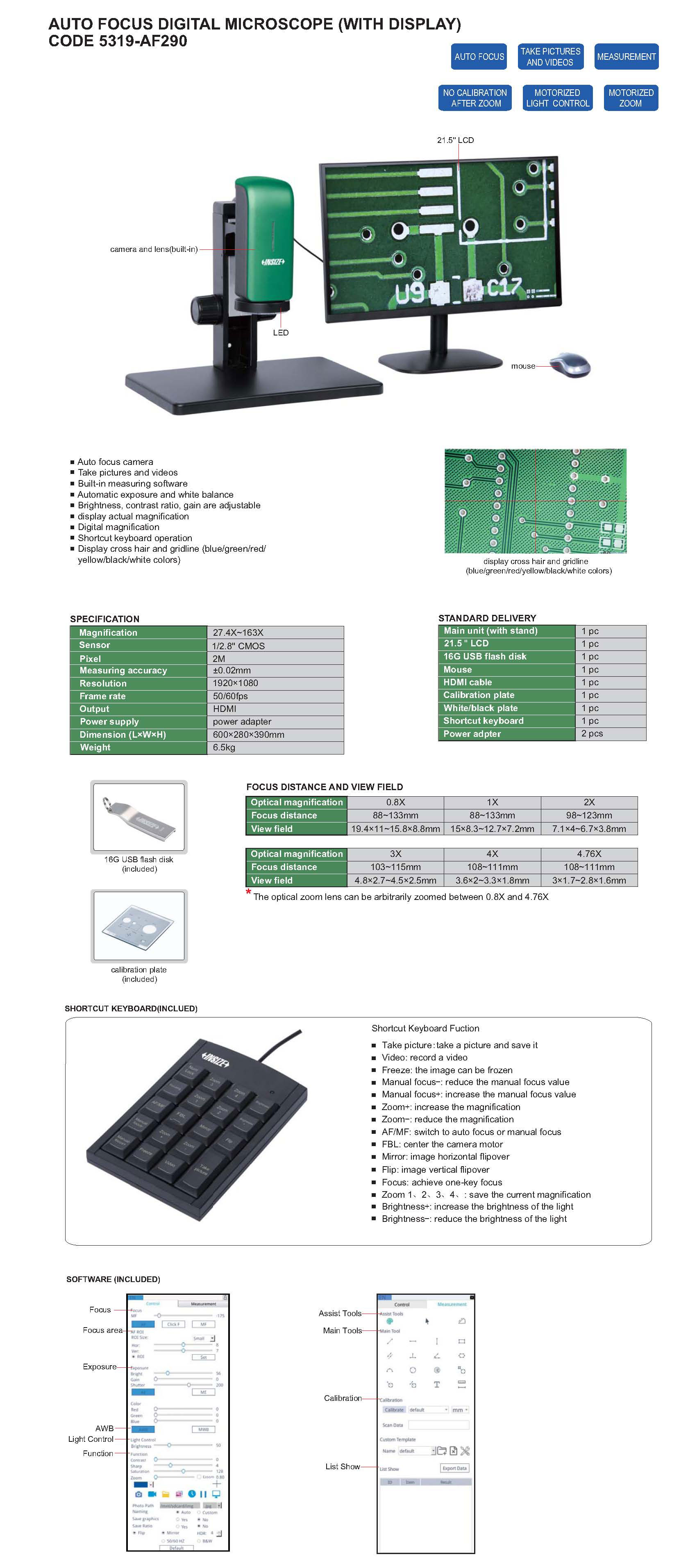 | 5319-AF290 | auto focus digital microscopes | 27.4X~163X | 19.4×11~15.8×8.8, 15×8.3~12.7×7.2, 7.1×4~6.7×3.8, 4.8×2.7~4.5×2.5, 3.6×2~3.3×1.8, 3×1.7~2.8×1.6 | 2M |