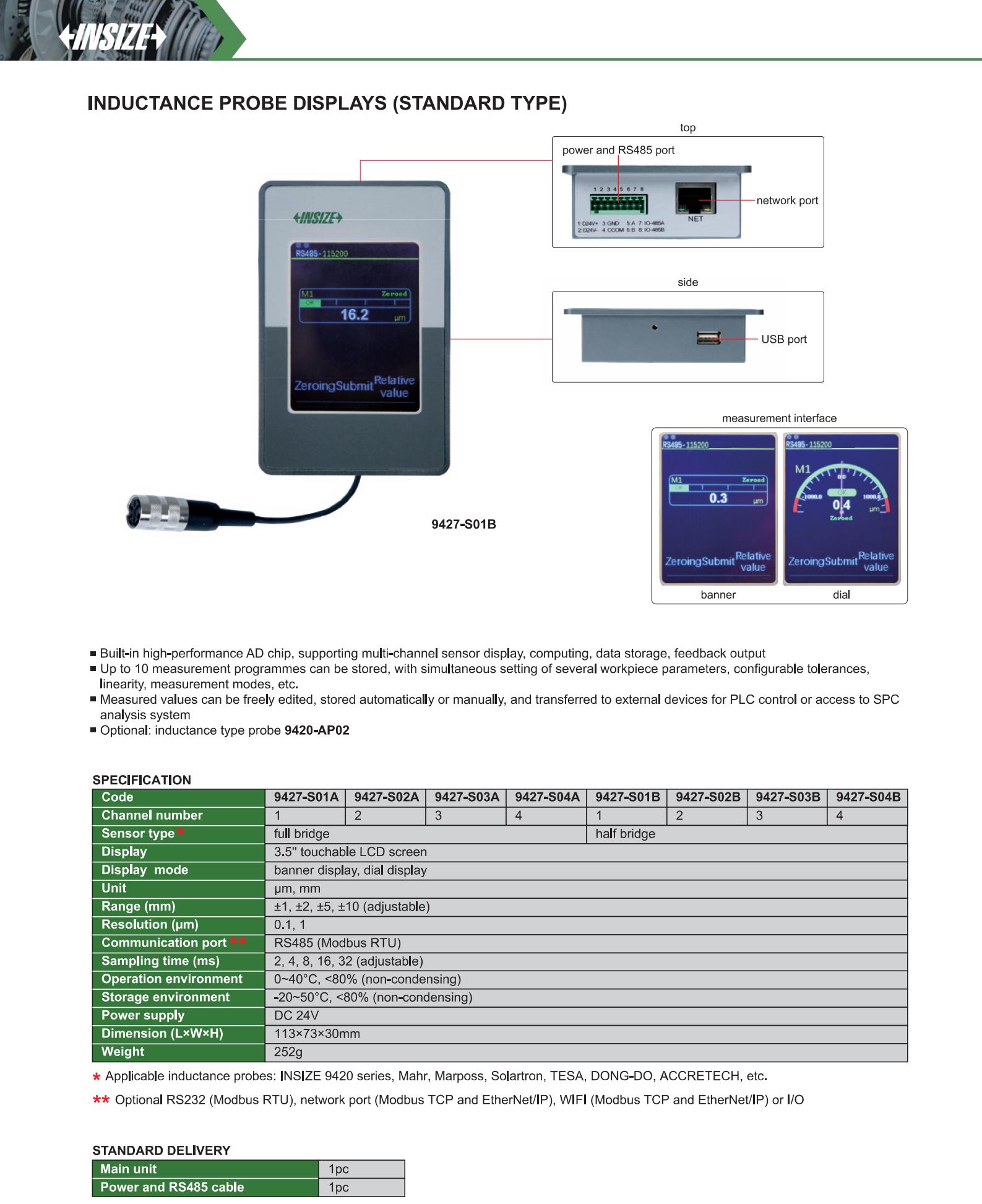| 9427-S01A | Inductance probe | full bridge | ±1, ±2, ±5, ±10mm (adjustable) | 0.1, 1µm | 1 |