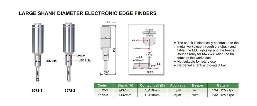 The shank is electrically conducted to the metal workpiece through the chuck and table. The LED lights up and the beeper sounds (only for 6572-2), when the ball touches the workpiece