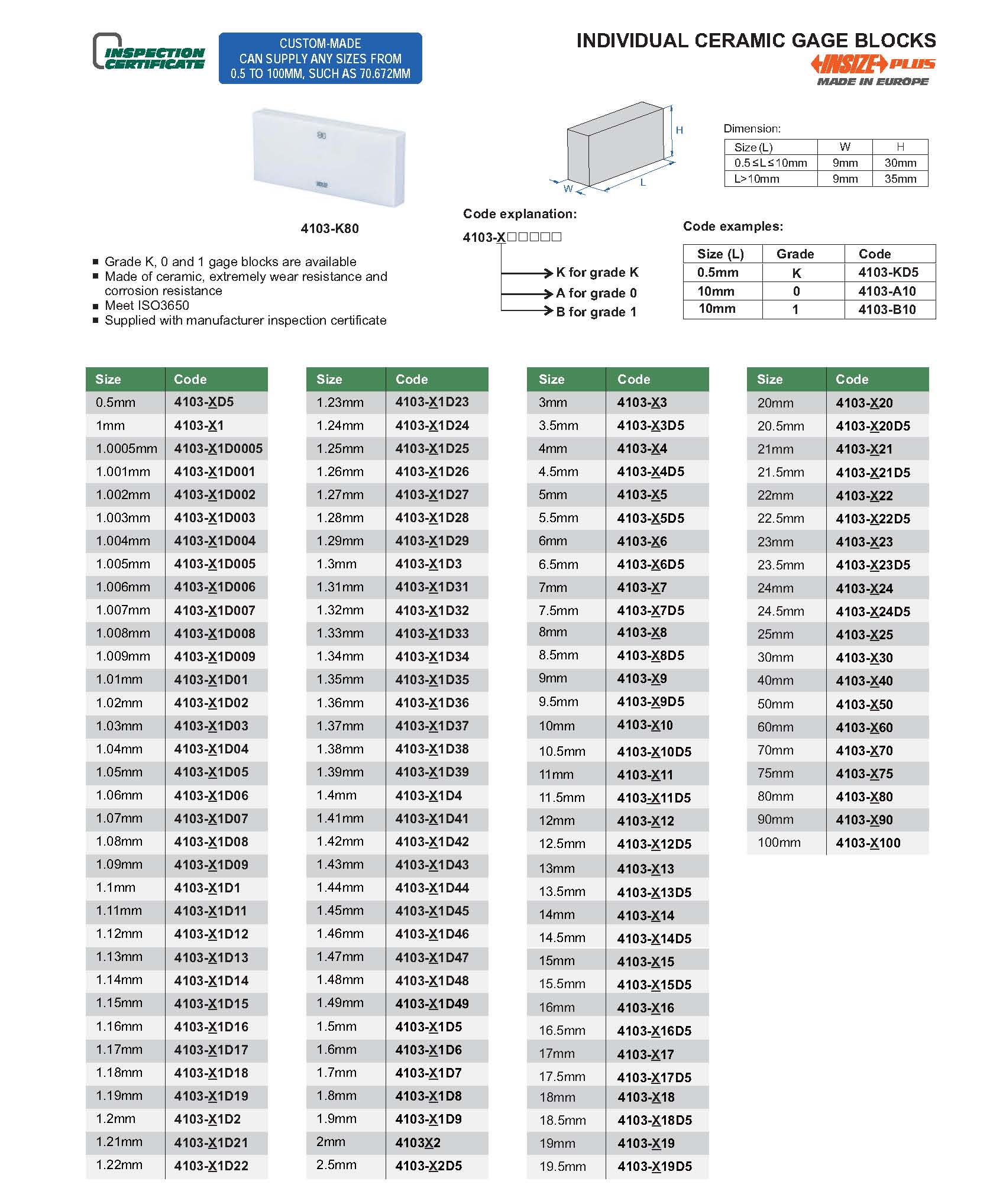 Grade K, 0 and 1 gauge blocks are available