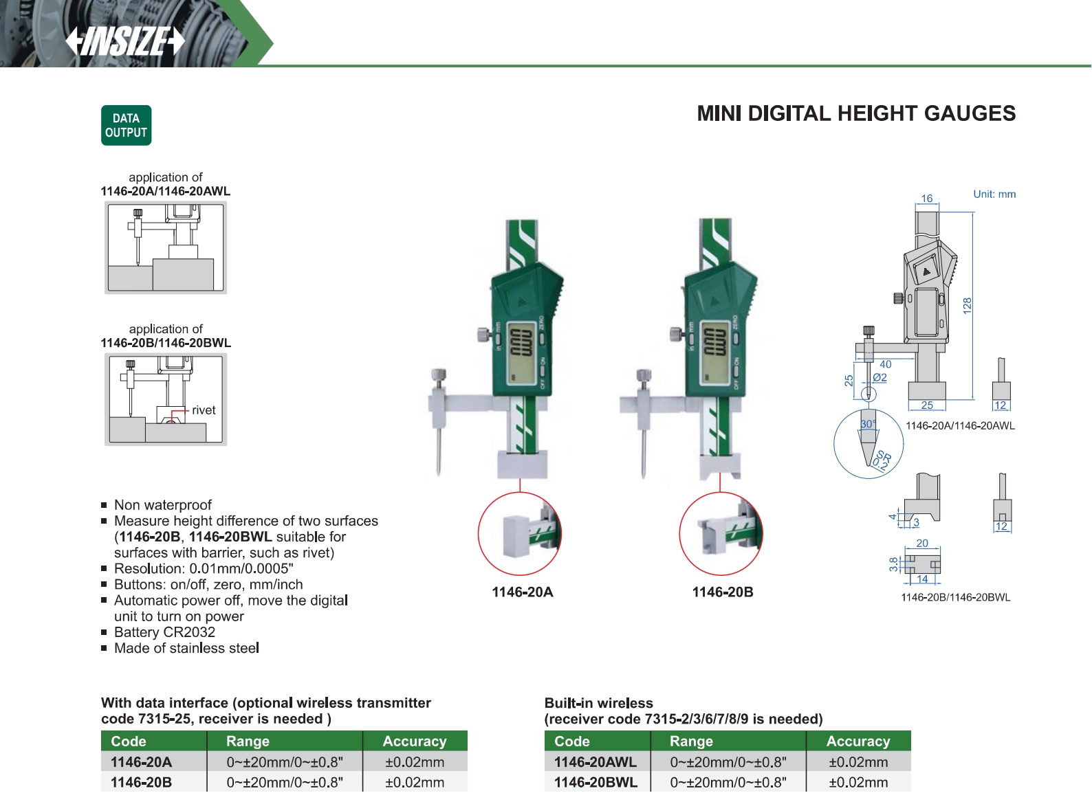| 1146-20AWL | 0~±20mm/0~±0.8" | ±0.02mm | 0.01mm/0.0005" |