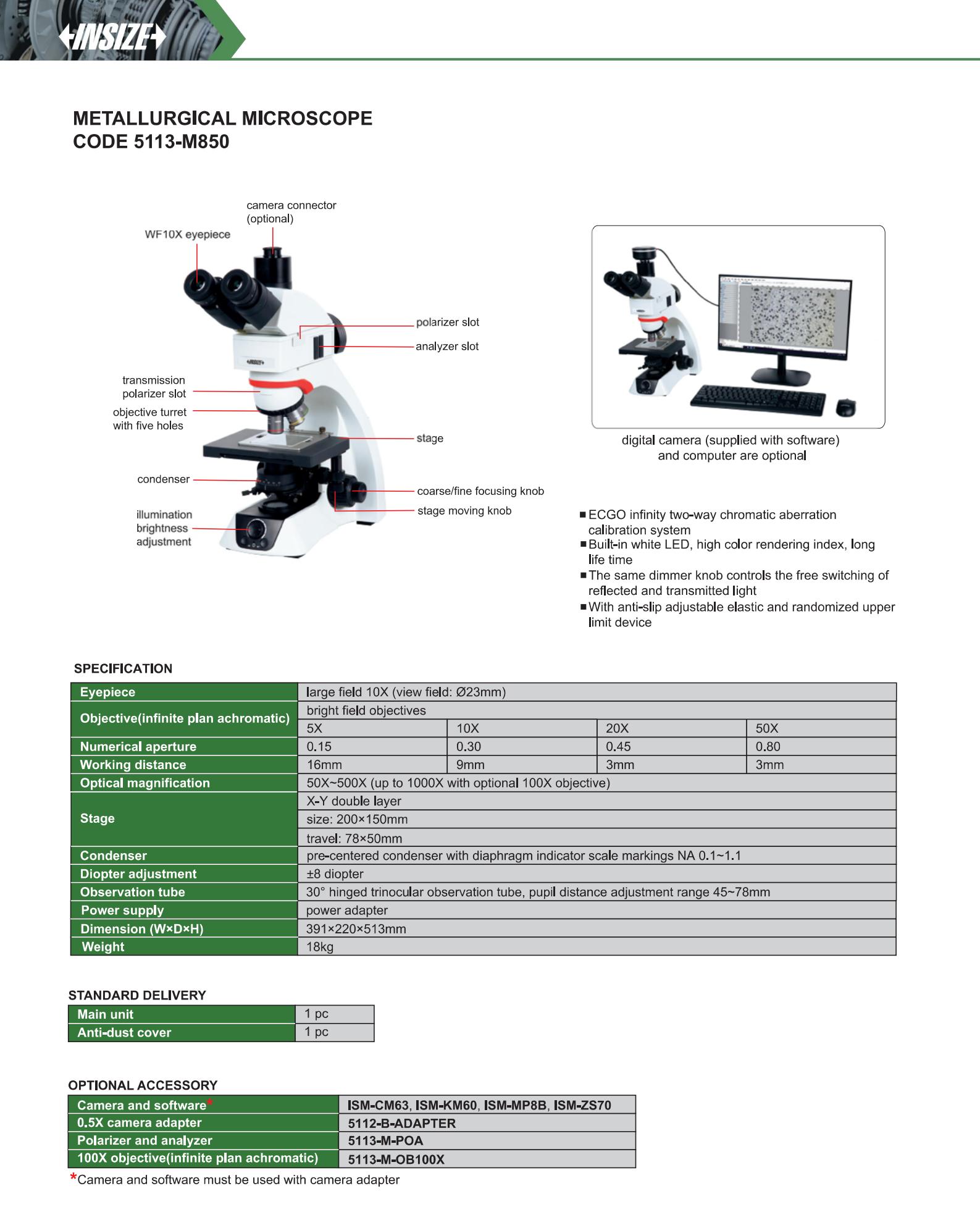 | 5113-M850 | size: 200×150mm, travel: 78x50mm | 50X~500X | 10X | bright field |