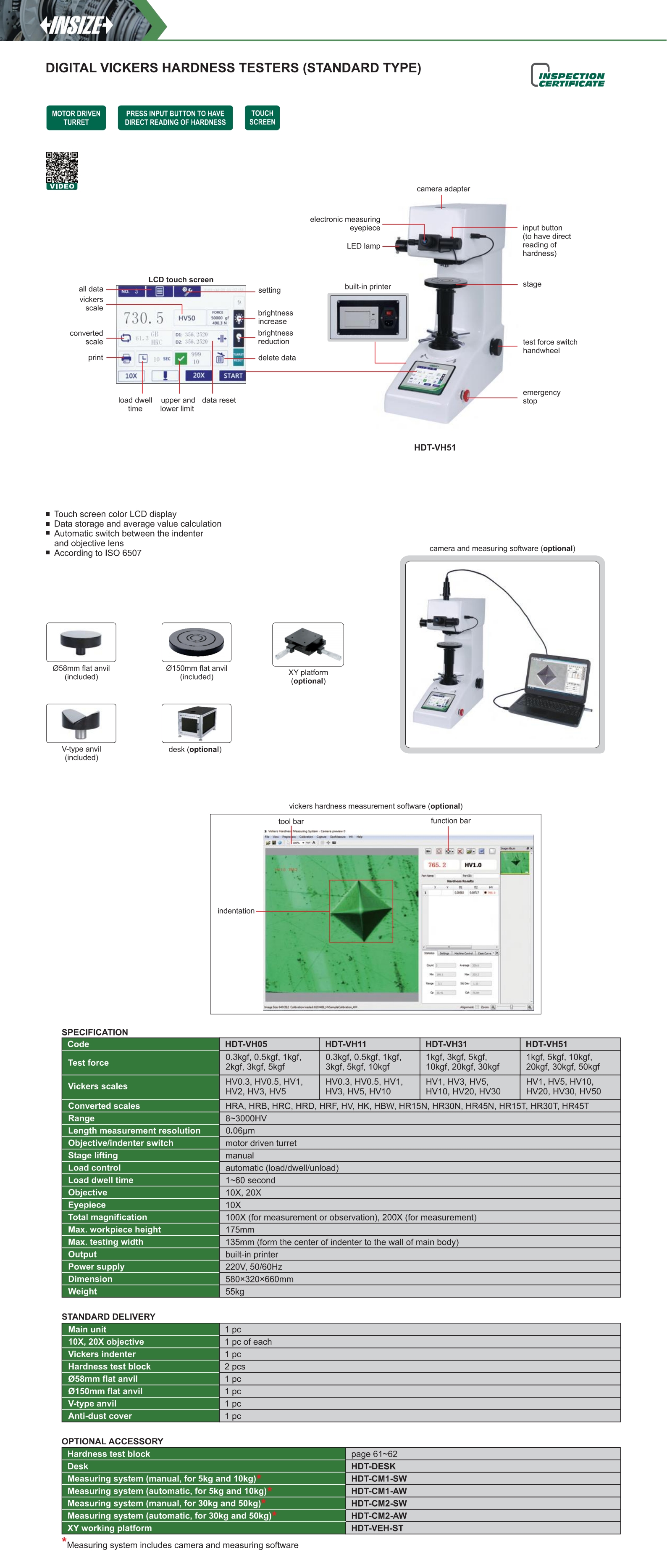 | HDT-VH51 | automatic (load/dwell/unload) | 175mm | 135mm | HV1~HV50 | 100X (for measurement or observation), 200X (for measurement) |