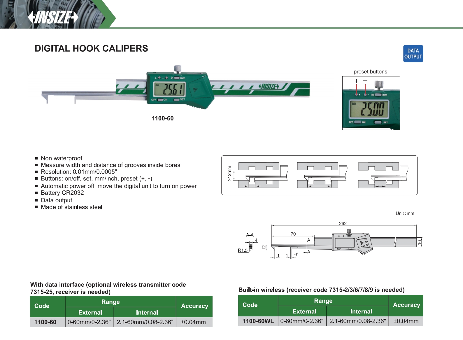 | 1100-60 | external 0-60mm/0-2.36", internal 2.1-60mm/0.08-2.36" | ±0.04mm | 0.01mm/0.0005" | with data interface |