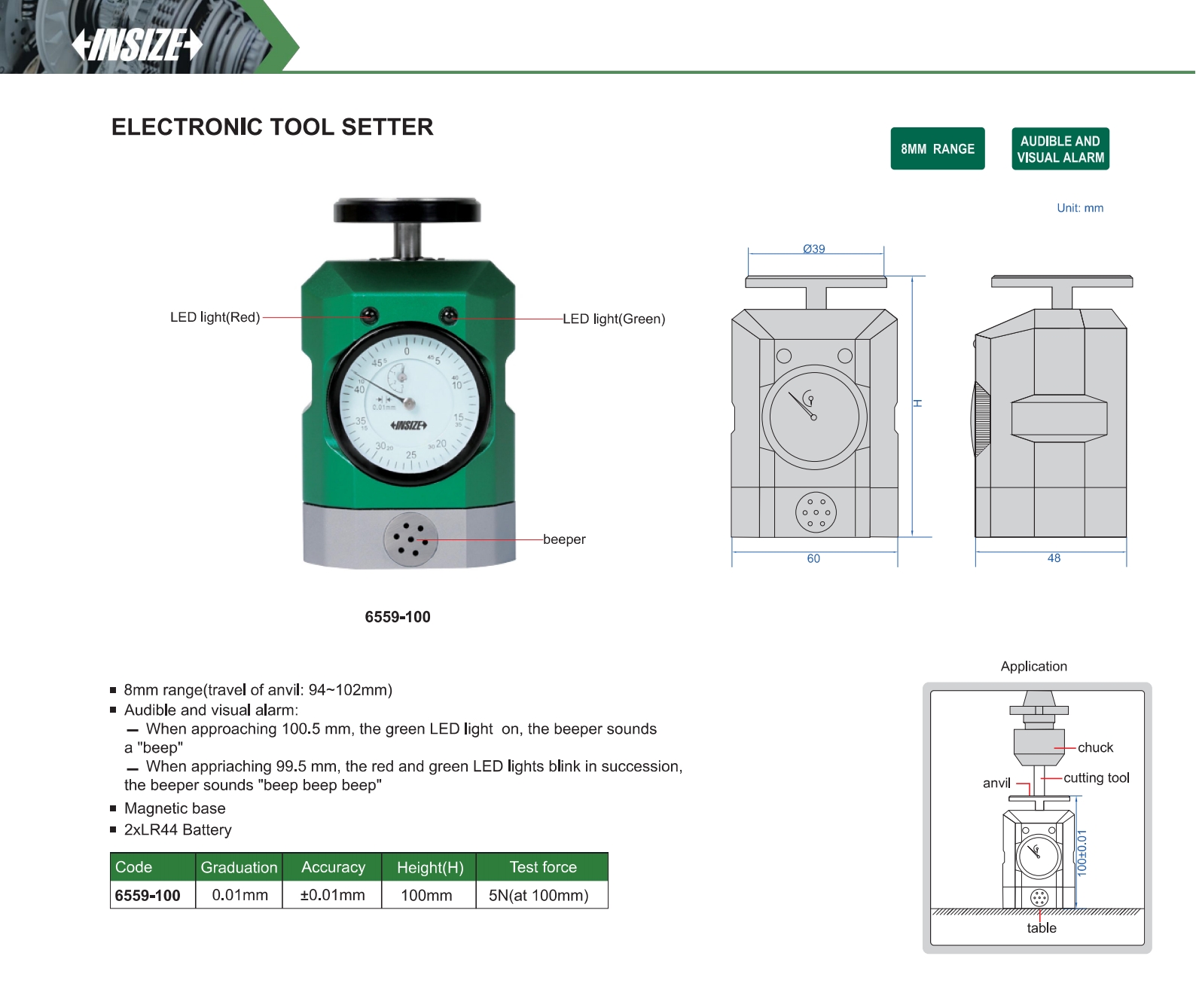 Audible and visual alarm: When approaching 100.5 mm, the green LED light on, the beeper sounds a "beep". When appriaching 99.5 mm, the red and green LED lights blink in succession, the beeper sounds "beep beep beep".