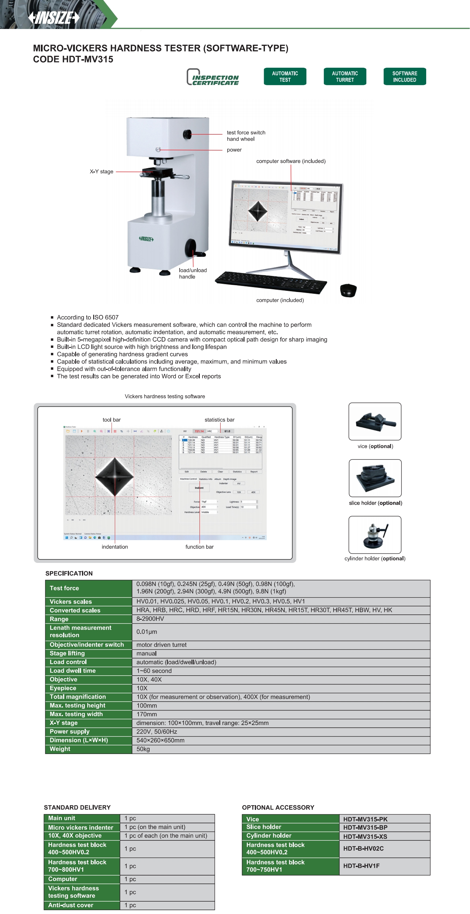 | HDT-MV315 | automatic (load/dwell/unload) | 100mm | 170mm | HV0.01, HV0.025, HV0.05, HV0.1, HV0.2, HV0.3, HV0.5, HV1 | 100X (for measurement or observation), 400X (for measurement) |