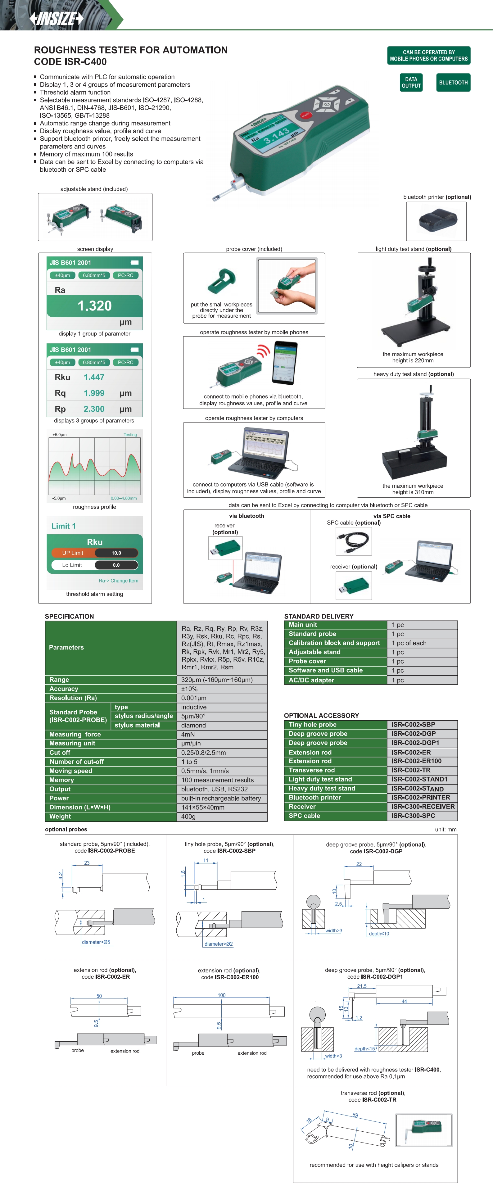 | ISR-C400 | 320μm (-160μm~160μm) | 4mN | 5µm/90° | bluetooth, USB, RS232 |