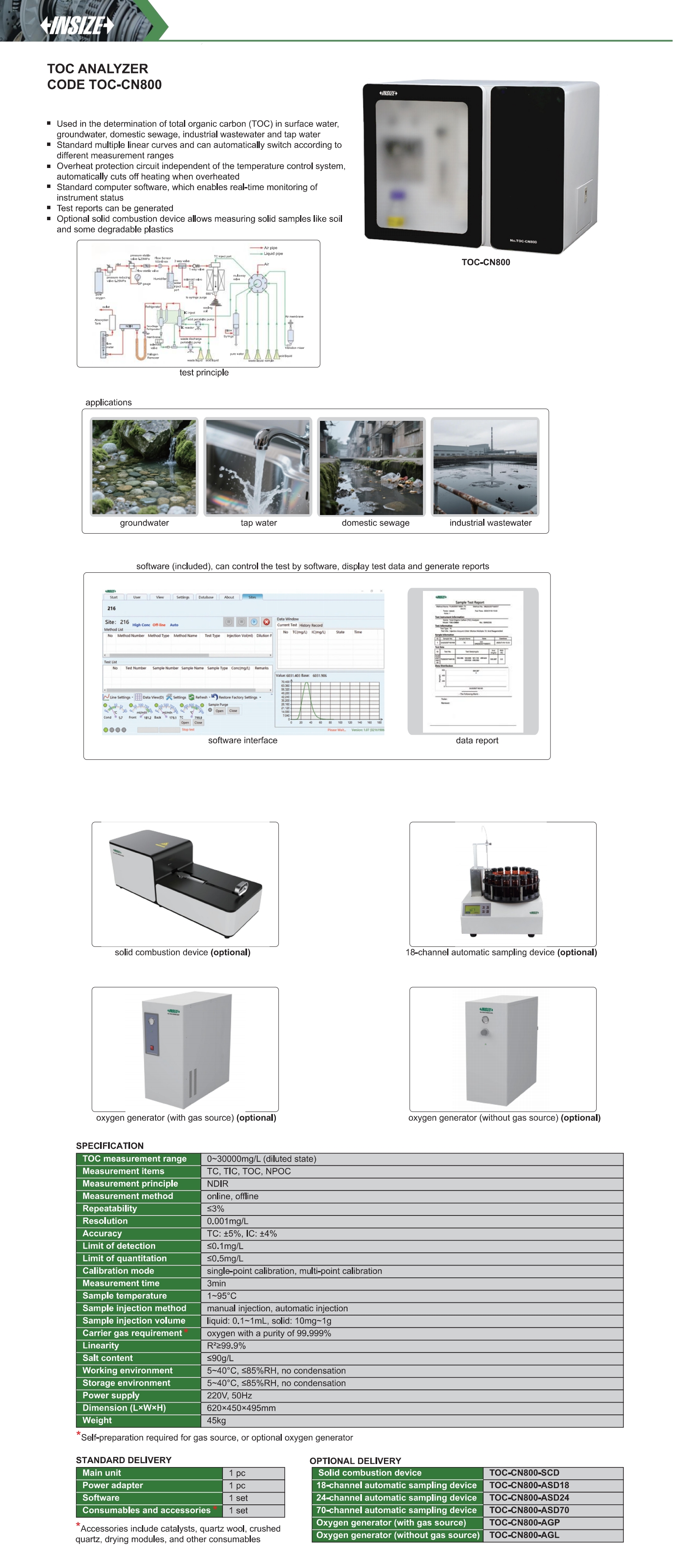| TOC-CN800 | TC, TIC, TOC, NPOC | NDIR | single-point calibration, multi-point calibration |