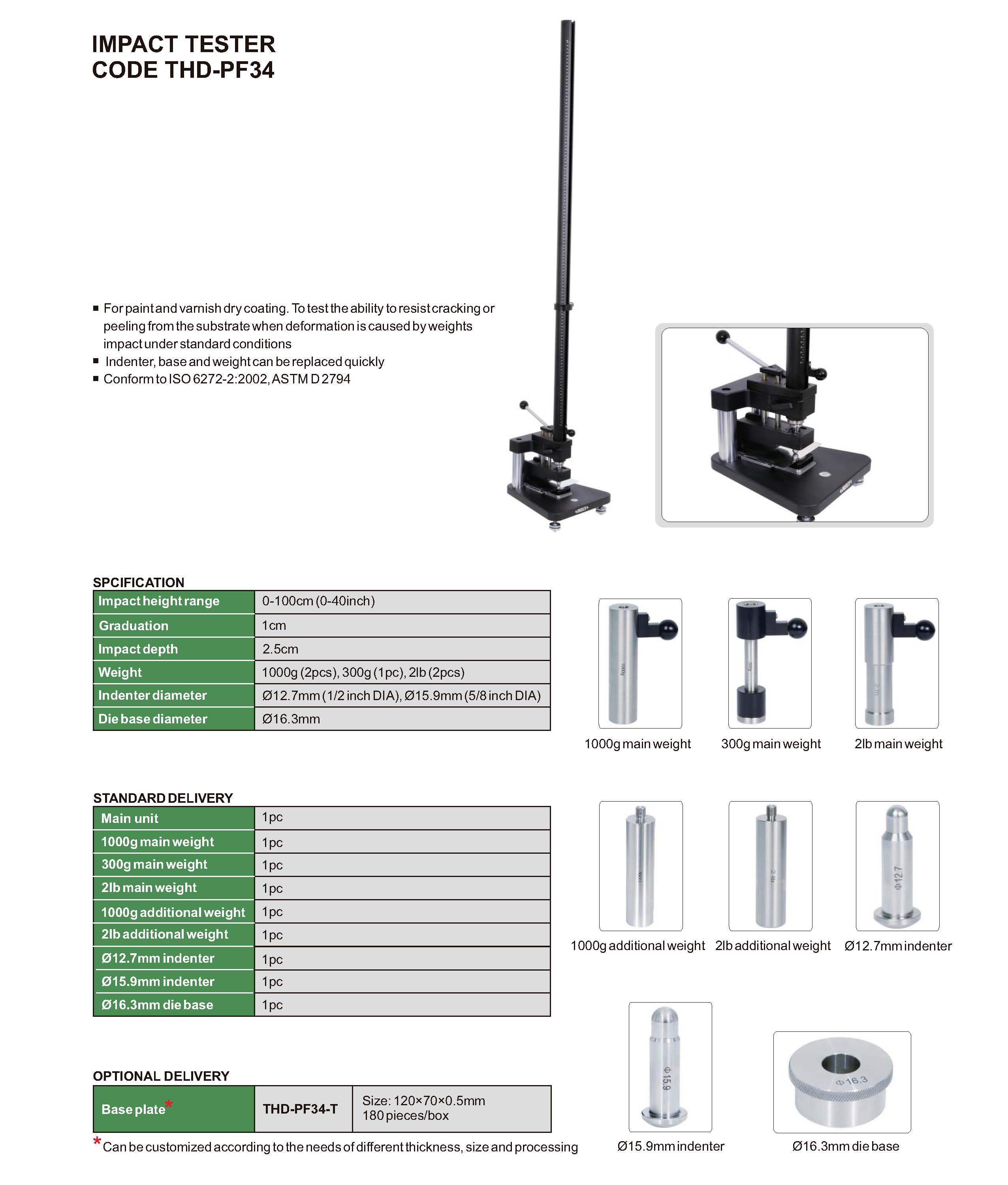 | THD-PF34 | 1000g (2pcs), 300g (1pc), 2lb (2pcs) | 0-100cm (0-40inch) | Ø12.7mm (1/2 inch DIA), Ø15.9mm (5/8 inch DIA) |