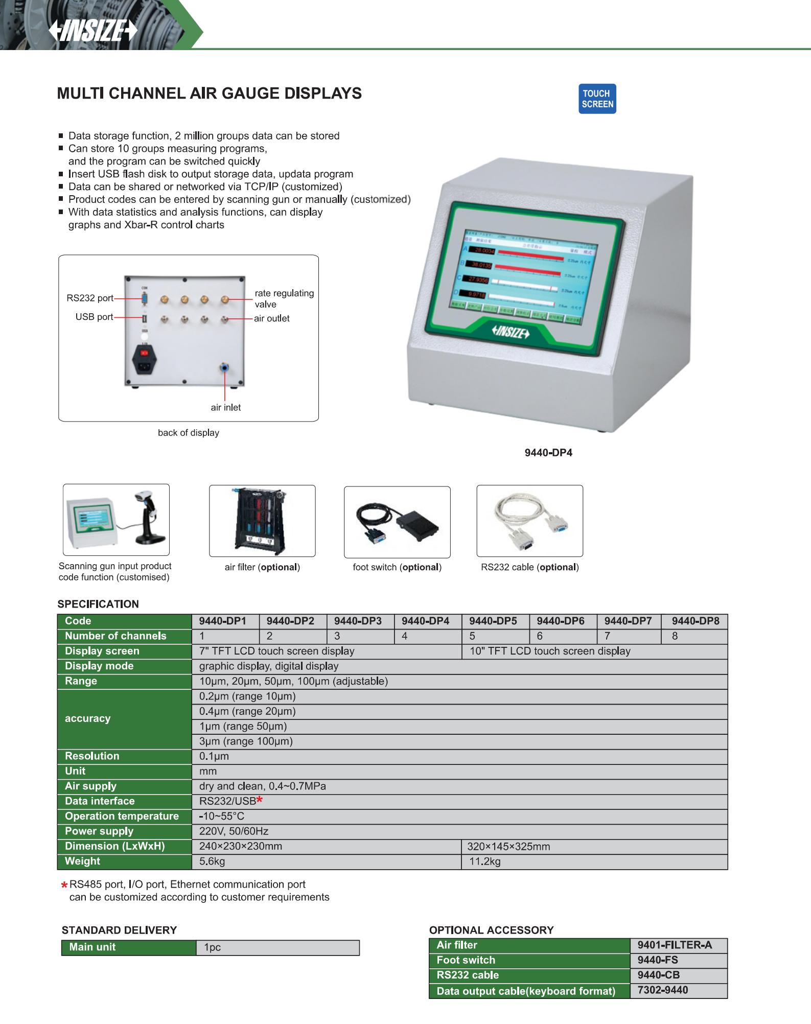 | 9440-DP4 | 10μm, 20μm, 50μm, 100μm (adjustable) | 0.2μm (range 10μm), 0.4μm (range 20μm), 1μm (range 50μm), 3μm (range 100μm) | 0.1μm |
