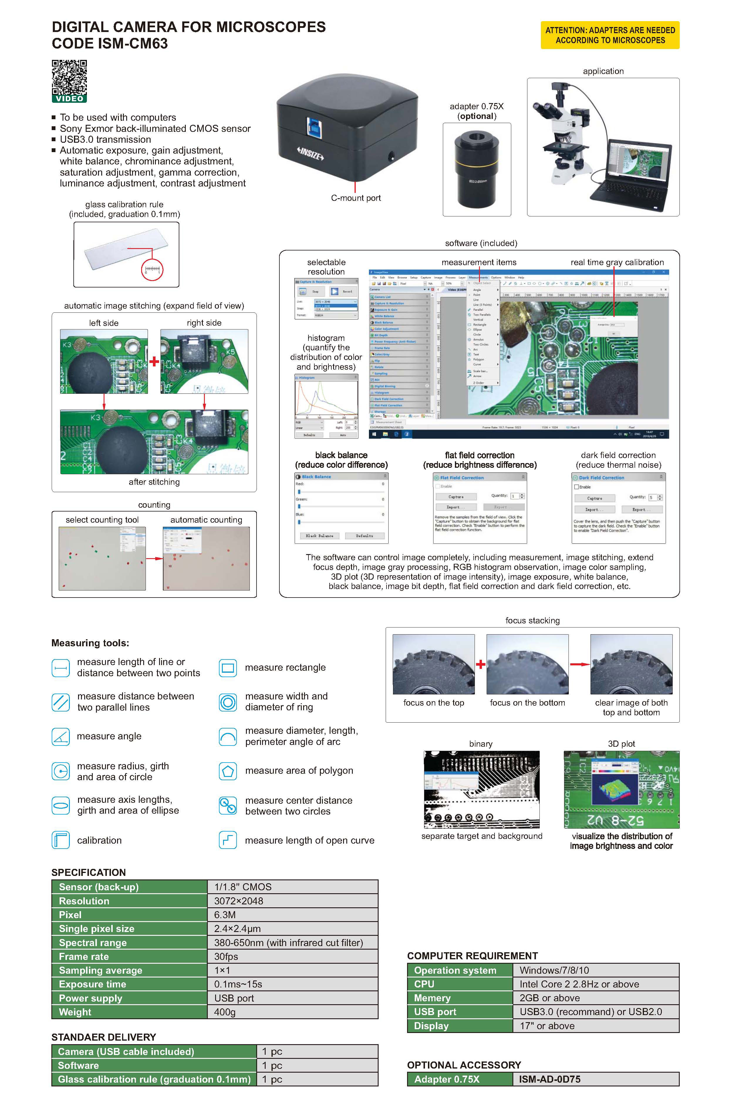 | ISM-CM63 | 1/1.8" CMOS | 3072x2048 | 6.3M | 30fps | 2.4x2.4μm |