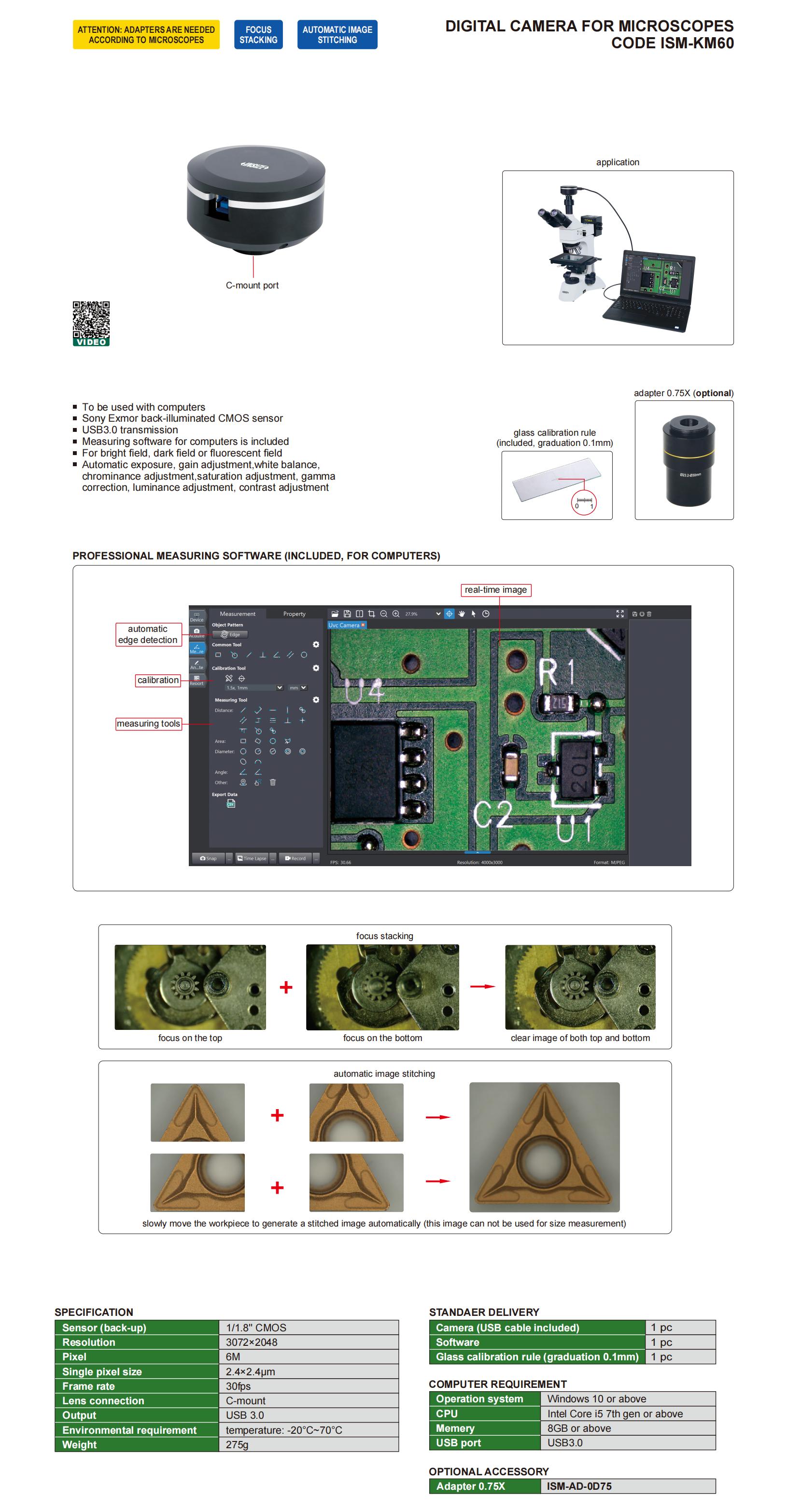 | ISM-KM60 | 1/1.8" CMOS | 3072x2048 | 6M | 30fps | 2.4x2.4μm |