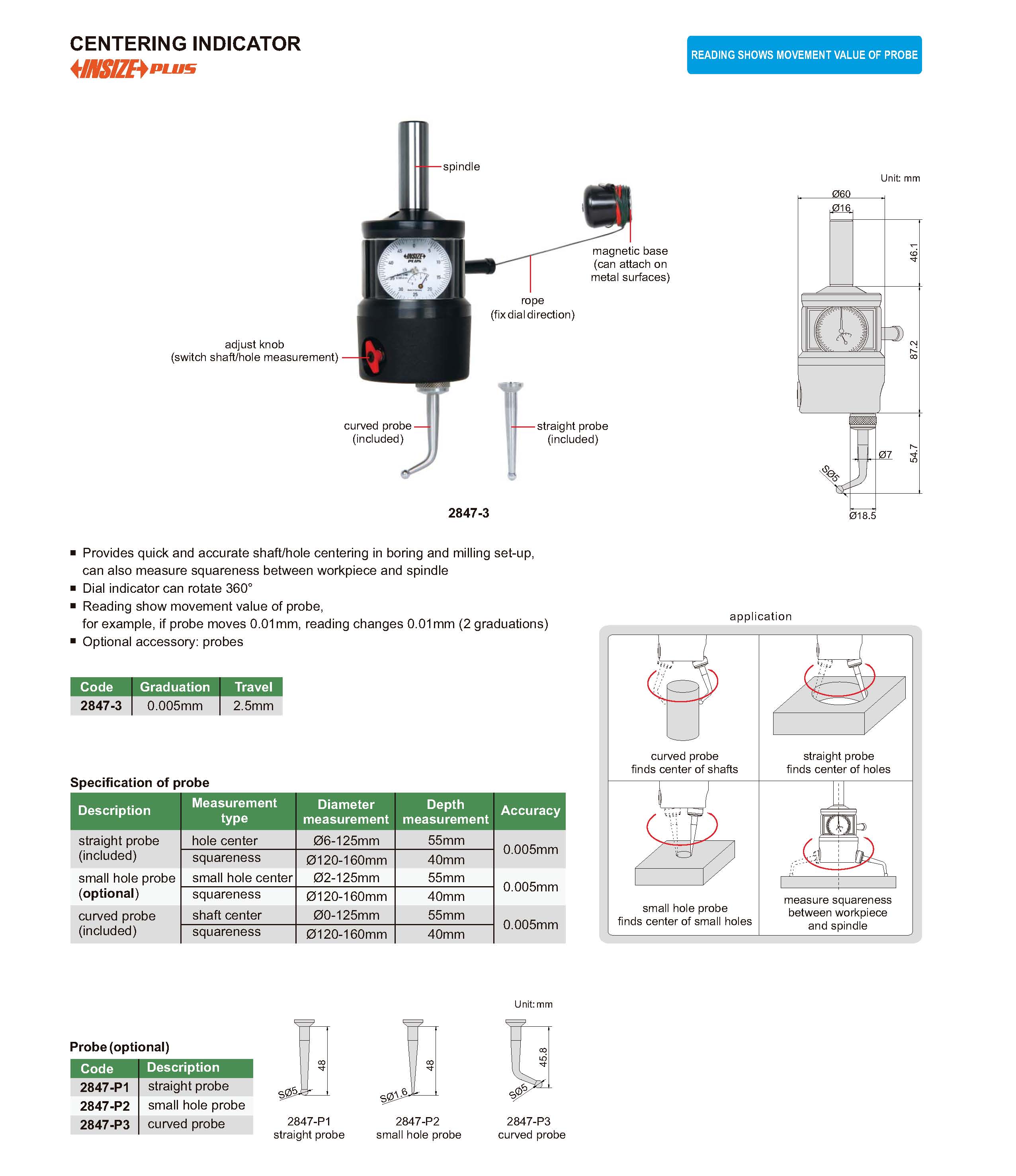 Provides quick and accurate shaft/hole centering in boring and milling set-up, can also measure squareness between workpiece and spindle