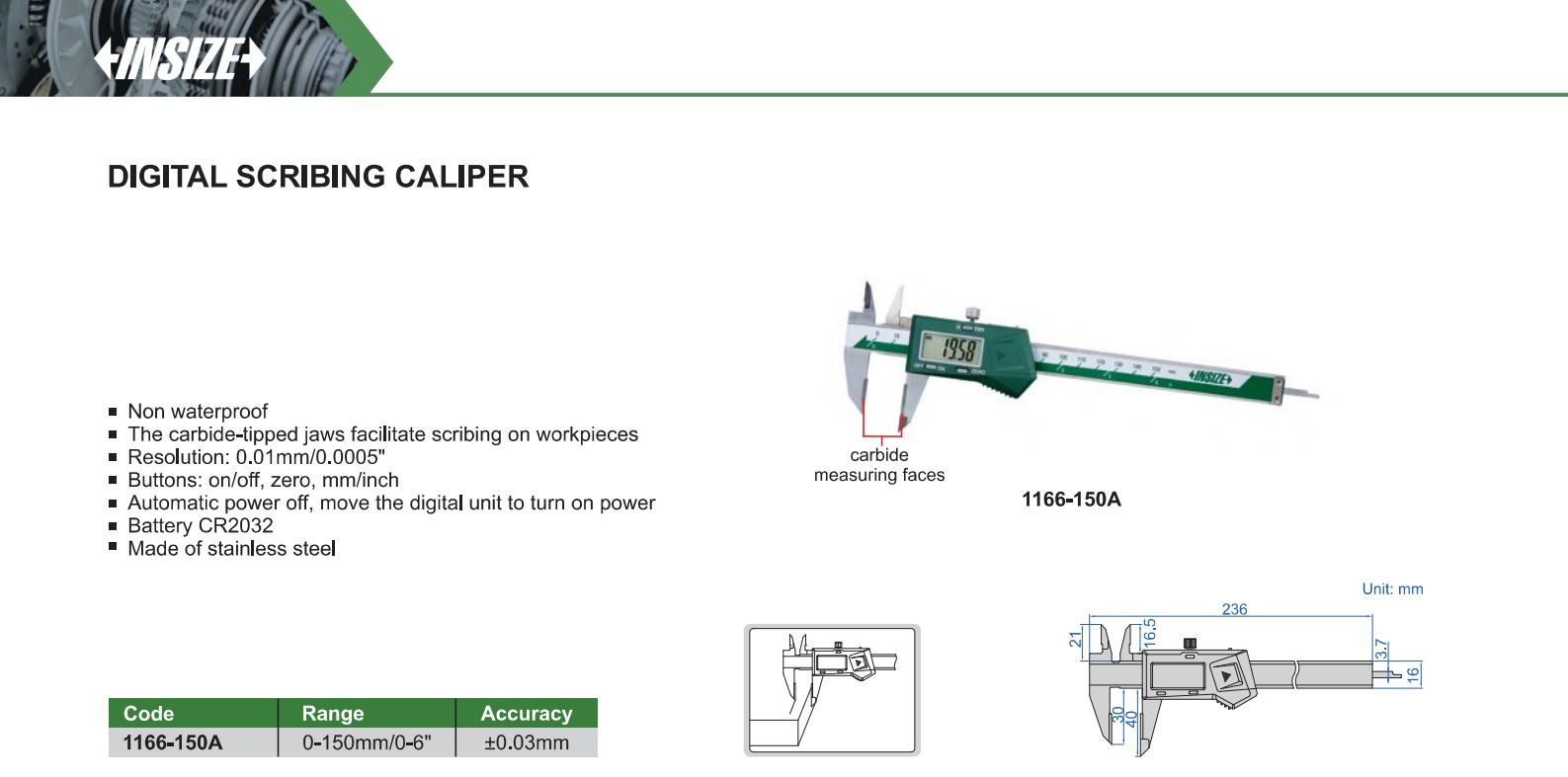 | 1166-150A | 0-150mm/0-6" | ±0.03mm | 0.01mm/0.0005" | with data interface |