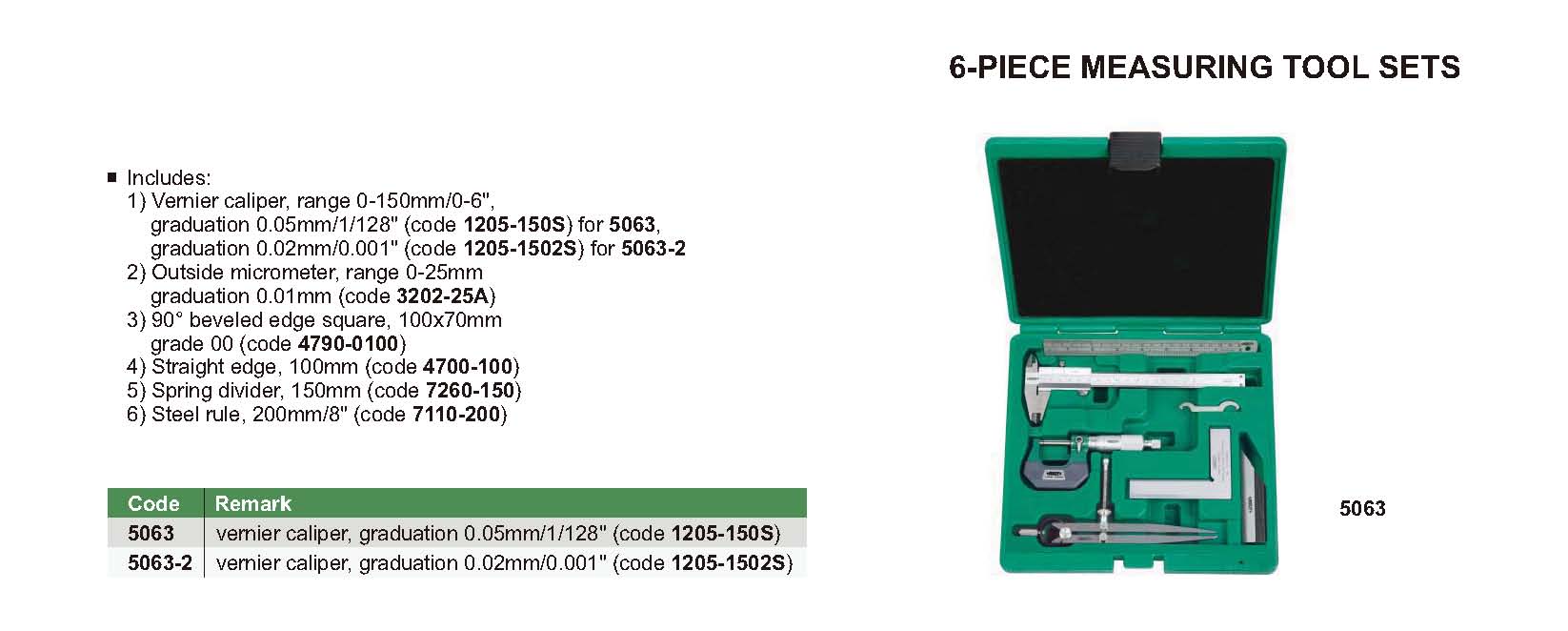 Vernier caliper, range 0-150mm/0-6", graduation 0.05mm/1/128" (code 1205-150S) for 5063, graduation 0.02mm/0.001" (code 1205-1502S) for 5063-2
