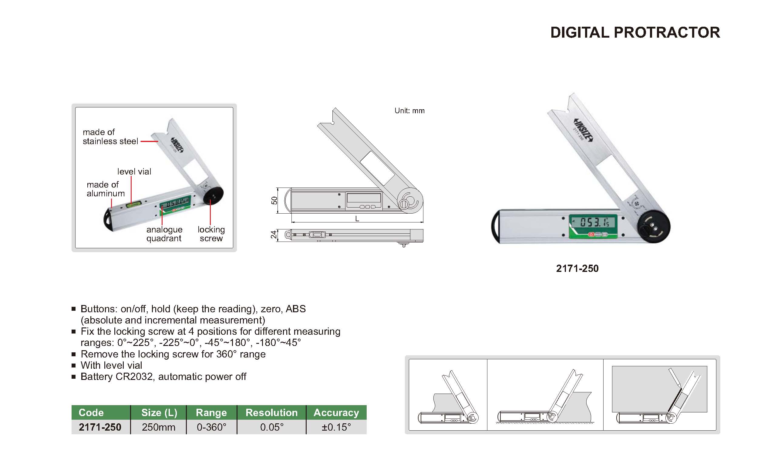 Fix the locking screw at 4 positions for different measuring ranges: 0°~225°, -225°~0°, -45°~180°, -180°~45°