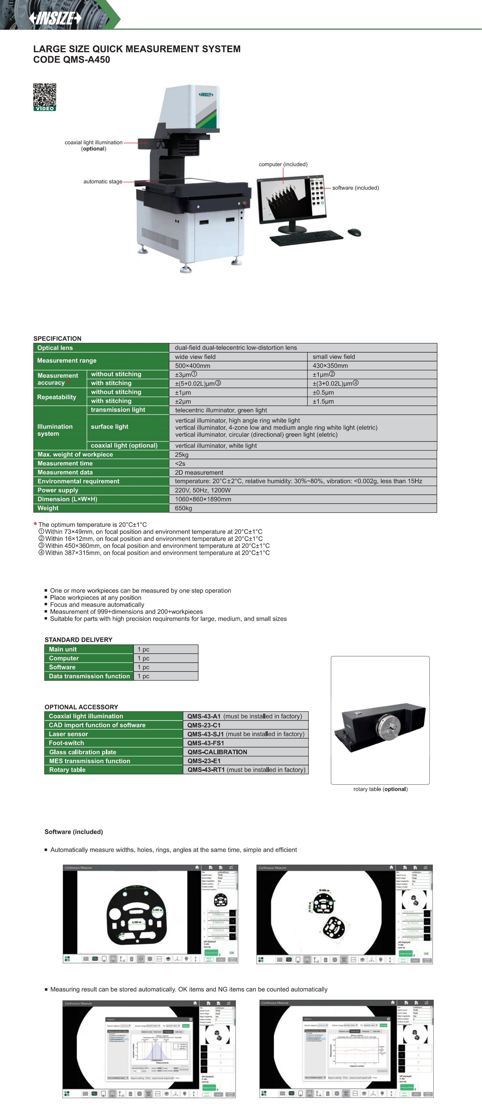 | QMS-A450 | wide view field:500×400mm/ small view field:430×350mm | wide view field:±3μm/small view field:±1μm | wide view field:±(5+0.02L)μm/small view field:±(3+0.02L)μm | wide view field:±1μm/small view field:±0.5μm | wide view field:±2μm/small view field:±1.5μm | 25kg |