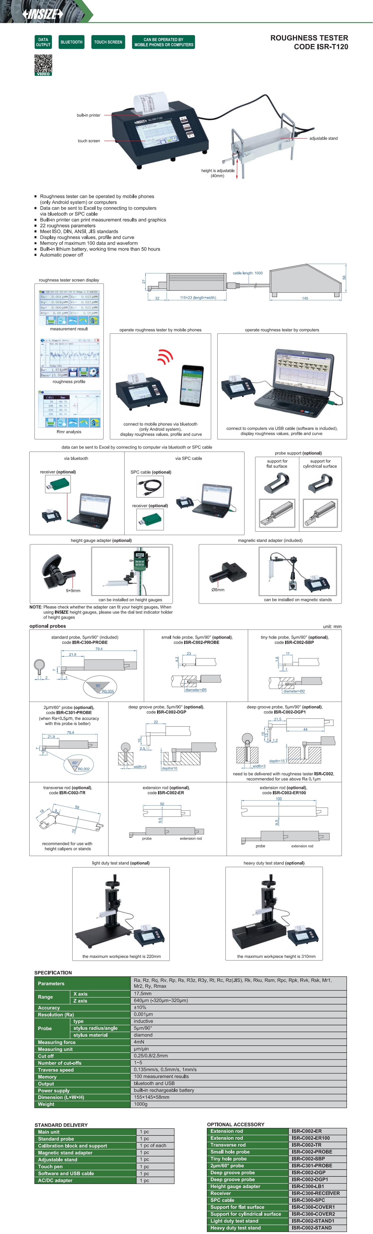 | Code | Range | Measuring force | Stylus radius/angle | Data output |