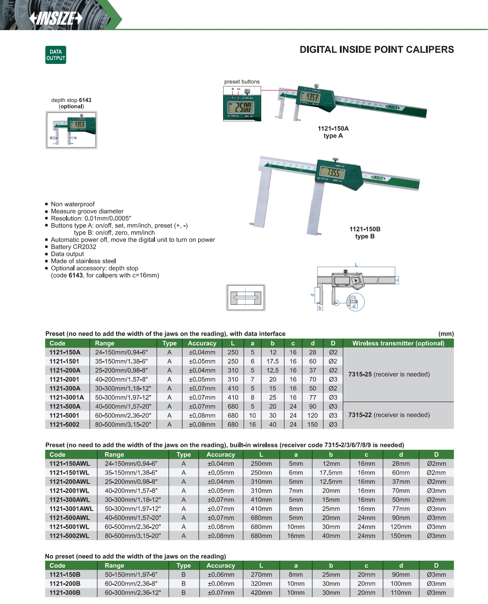 | 1121-150A | A | 24-150mm/0.94-6" | ±0.04mm | 0.01mm/0.0005" | with data interface |