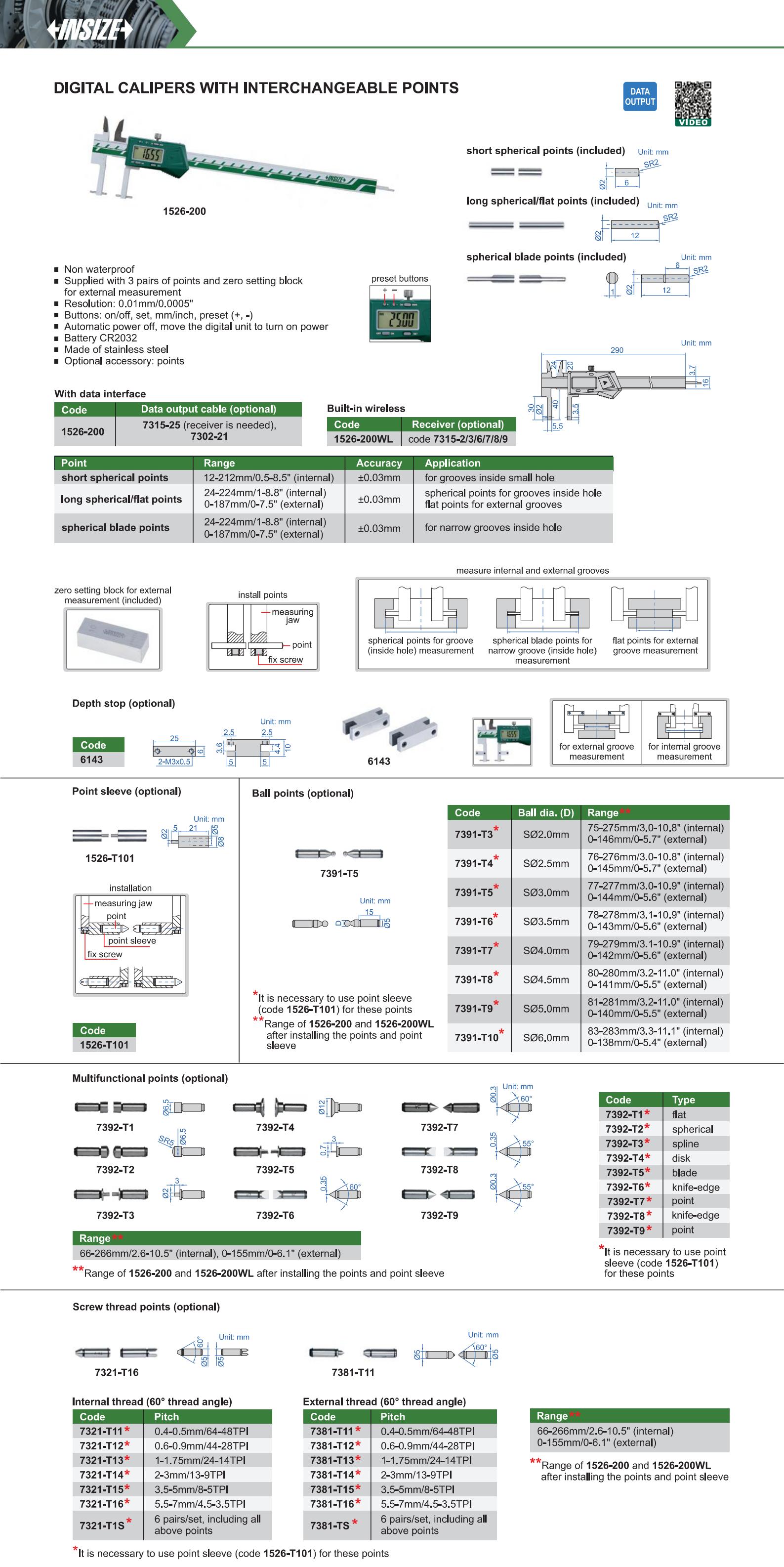 | 1526-200 | 24-224mm (internal), 0-187mm (external) | ±0.03mm | 0.01mm/0.0005" | with data interface | spherical blade points |