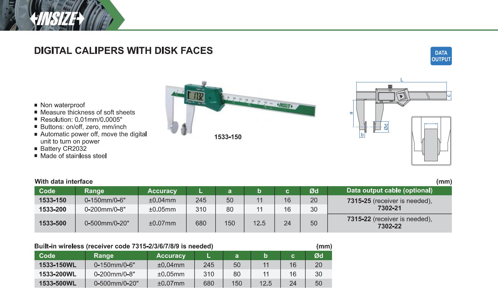 | 1533-150WL | 0-150mm/0-6" | ±0.04mm | 0.01mm/0.0005" | built-in wireless |