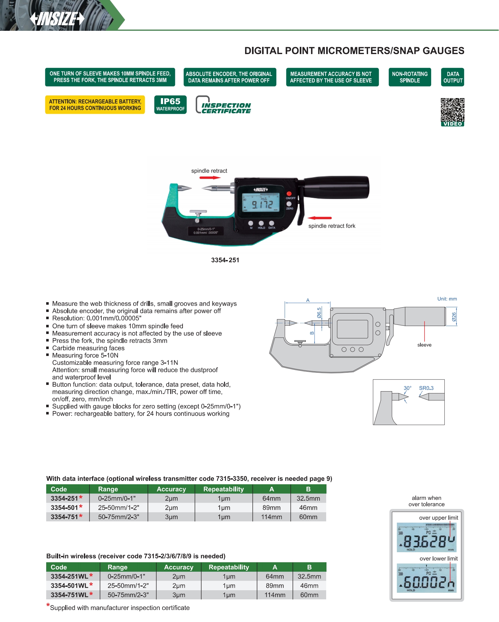 | 3354-251AWL | 0-25mm/0-1" | 2μm | 0.001mm/0.00005" | built-in wireless |
