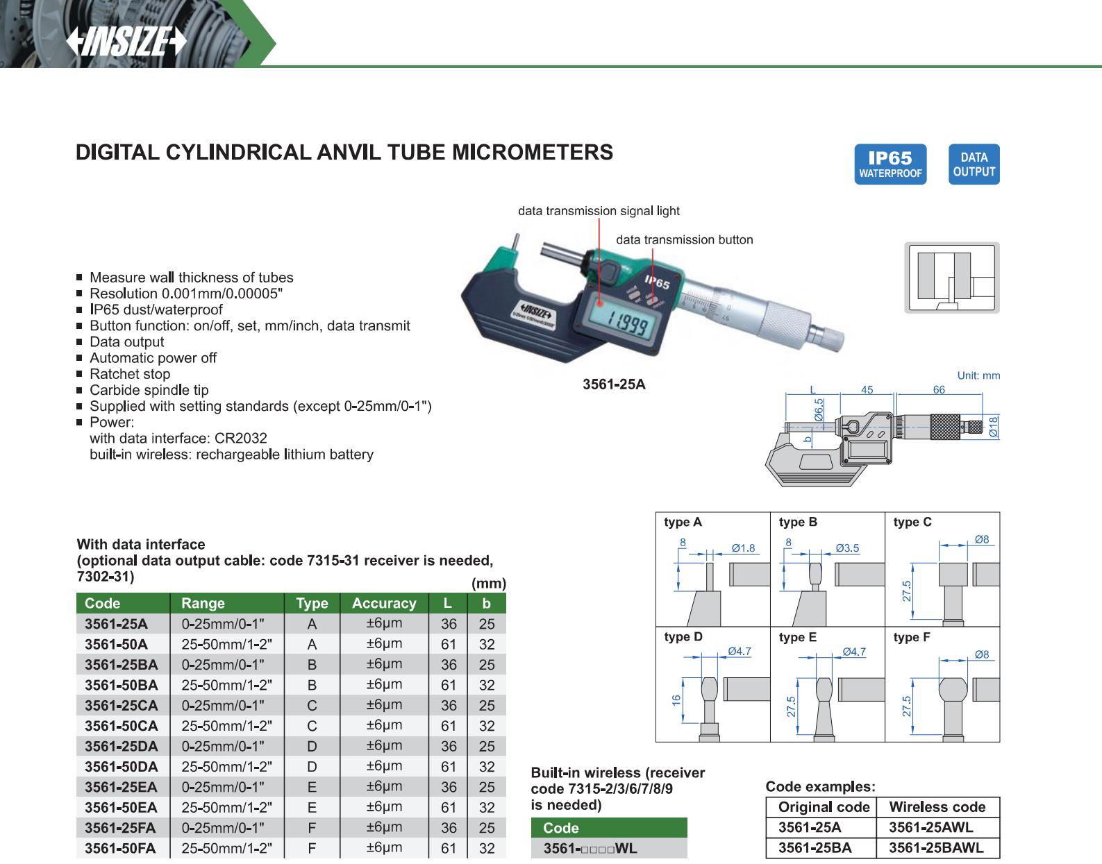 | 3561-25DAWL | D | 0-25mm/0-1" | ±6μm | 0.001mm/0.00005" | built-in wireless |