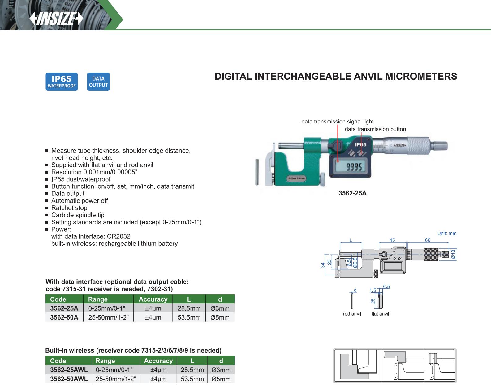 | 3562-50A | 25-50mm/1-2" | ±4μm | 0.001mm/0.00005" | with data interface |