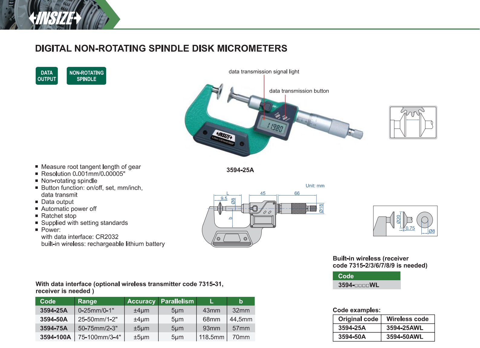 | 3594-75A | 50-75mm/2-3" | ±5μm | 0.001mm/0.00005" | with data interface |