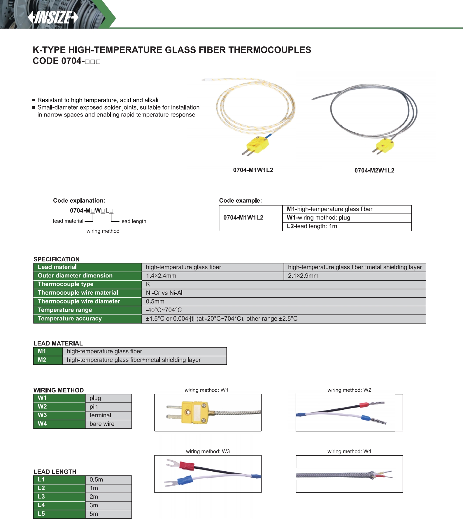 | 0704-□□ | K | thermocouple | -40°C~704°C | ±1.5°C or 0.004∙|t| |