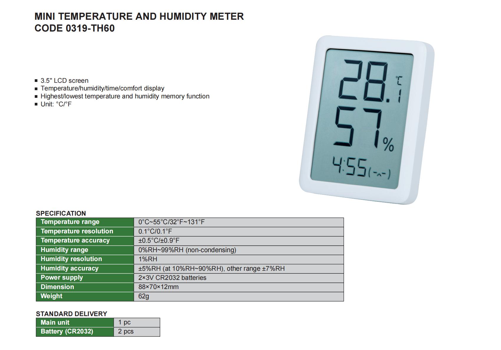 | 0319-TH60 | Digital | Internal | ±0.5°C/±0.9°F | 0%RH~99%RH (non-condensing) | ±5%RH (at 10%RH~90%RH), other range ±7%RH | 0°C~55°C/32°F~131°F |