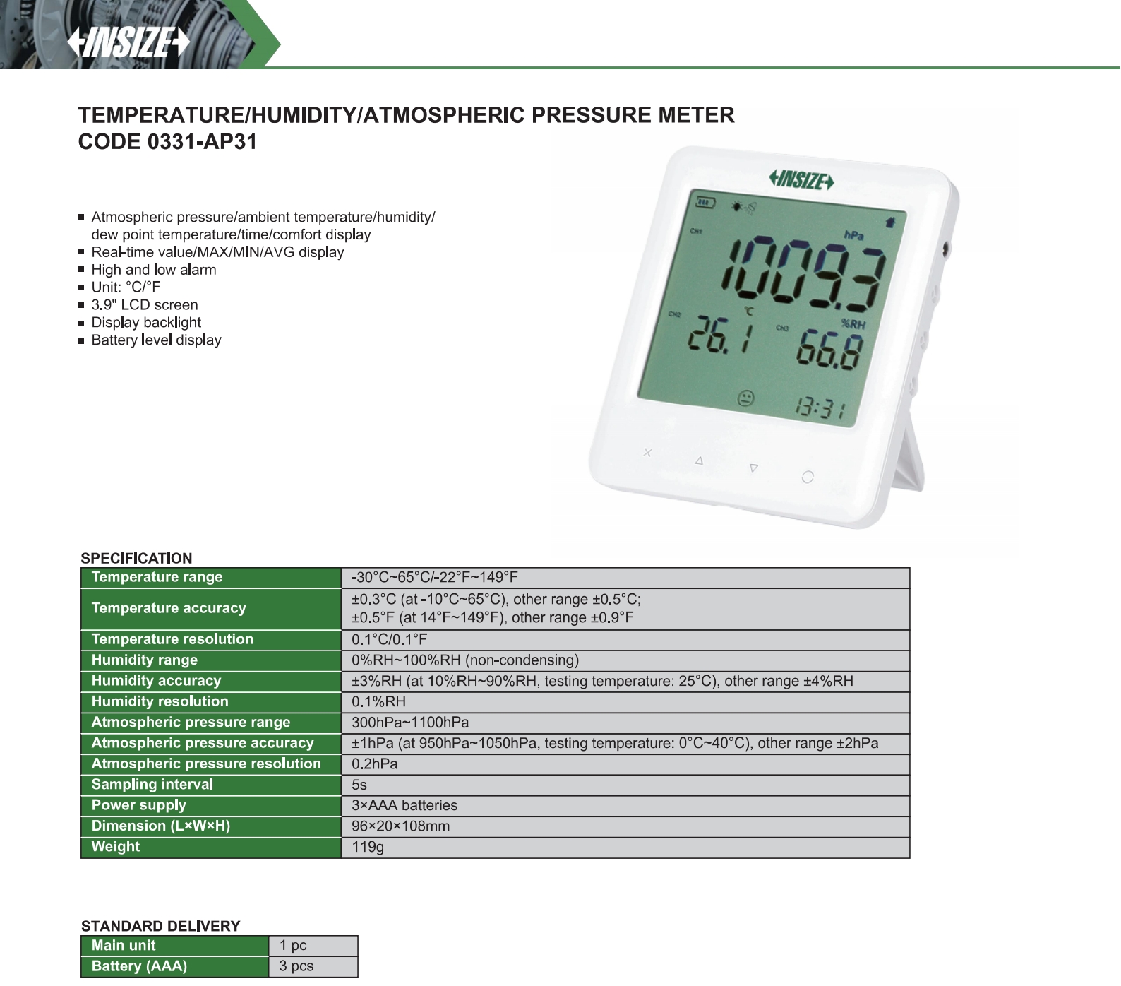| 0331-AP31 | Digital | Internal | ±0.3°C(at -10°C~65°C), other range ±0.5°C; ±0.5°F(at 14°F~149°F), other range ±0.9°F | 0%RH~100%RH (non-condensing) | ±3%RH (at 10%RH~90%RH, testing temperature: 25°C), other range ±4%RH | yes | -30°C~65°C/-22°F~149°F |