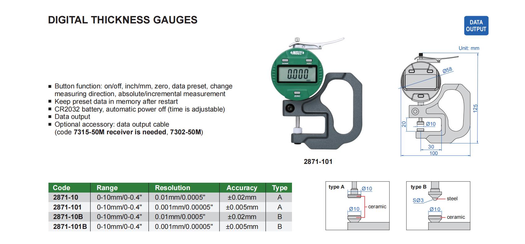 | 2871-101B | 0-10mm/0-0.4" | ±0.005mm | 0.001mm/0.00005" |