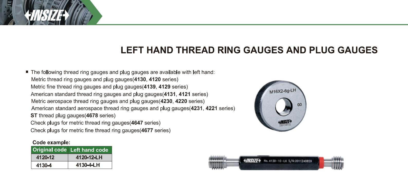 The following thread ring gauges and plug gauges are available with left hand: Metric thread ring gauges and plug gauges (4130, 4120 series), Metric fine thread ring gauges and plug gauges (4139, 4129 series), American standard thread ring gauges and plug gauges (4131, 4121 series), Metric aerospace thread ring gauges and plug gauges (4230, 4220 series), American standard aerospace thread ring gauges and plug gauges (4231, 4221 series), ST thread plug gauges (4678 series), Check plugs for metric thread ring gauges (4647 series), Check plugs for metric fine thread ring gauges (4677 series)